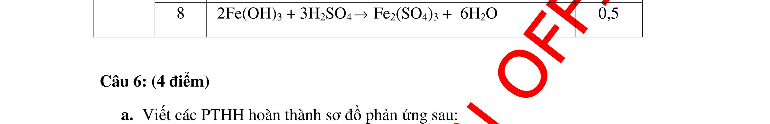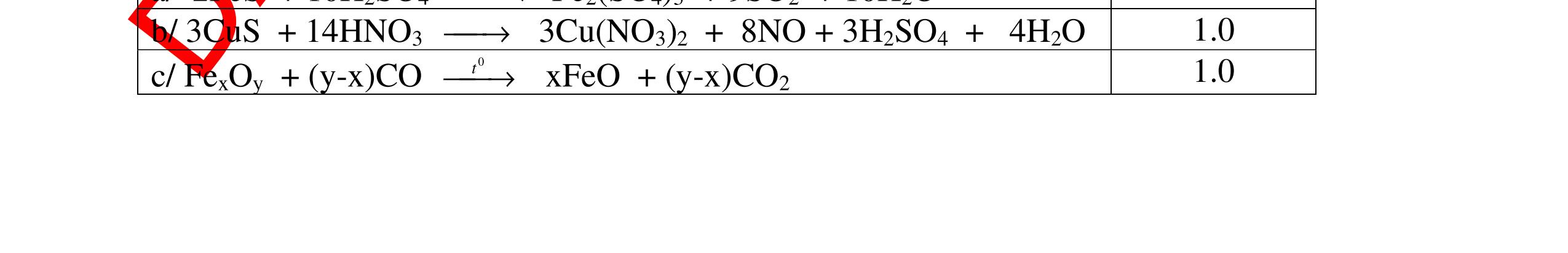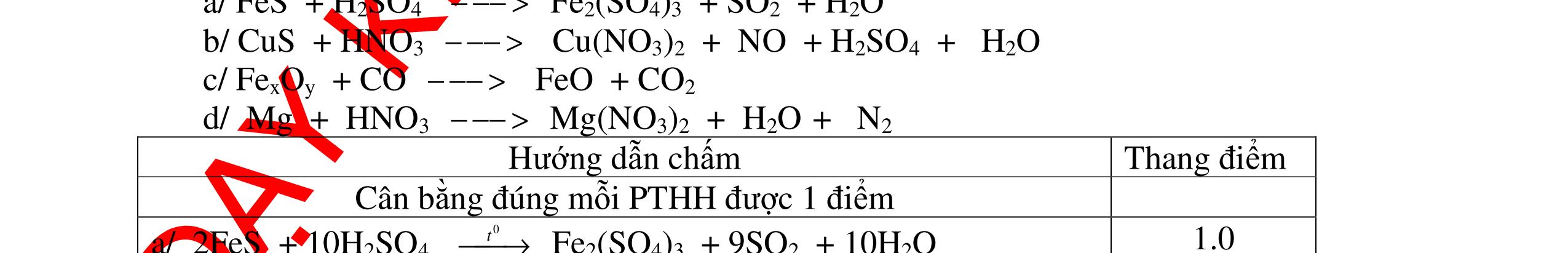 DẠYKÈMQUYNHƠNOFFICIAL A B FeCl3 Fe(OH)3 B A 6 Al2O3 7 Al 5 1 1 Cu + 2H2SO4 đ 0t → CuSO4 + 2H2O + SO2 0,5 2 MnO2 + 4HCl 0t → MnCl2 + Cl2 + 2H2O 0,5 3 Fe(OH)3 + H2SO4 → Fe2(SO4)3 + H2O 0,25 4 4CO + Fe3O4 0t → 3 Fe + 4CO2 0,5 5 FexOy + yH2 0t → xFe + yH2O 0,5 6 FexOy + 2yHCl → xFeCl2y/x + yH2O 0,5 2 A là Fe, B là Fe2O3 0.25 1 4Fe + 3O2 0t → 2 Fe2O3 0,25 2 Fe2O3 + 6HCl → 2FeCl3 + 3H2O 0,25 3 FeCl3 + 3 NaOH → Fe(OH)3 + 3NaCl 0,25 4 2Fe(OH)3 0t → Fe2O3 + 3H2O 0,25 5 Fe2O3 + 3H2 0t → 2Fe + 3H2O 0,25 6 Fe2O3 + 2Al 0t → 2Fe + Al2O3 0,5 7 2Al2O3 đpnc 4Al + 3O2 0,25 Câu6:(5 điểm) 1. Cânbằngcácphươngtrinhphản ứnghóahọcsau: 1. FeS2 + O2 → Fe2O3 + SO2 2. P + KClO3 → P2O5 + KCl 3. C3H8 + HNO3 → CO2 + NO + H2O 4. CH3COOH + Na2CO3 → CH3COONa + H2O + CO2 5. Fe3O4 + HNO3 → Fe(NO3)3 + NO2 + H2O 6. S + NaOH → Na2S + Na2SO4 + H2O 7. CxHyOz + O2 → CO2 + H2O 8. FeClx + Cl2 → FeCl3 9.FexOy + yH2 0t → xFe + yH2O 10. FexOy + yCO ----> xFeO + yCO2 1 4FeS2 + 11O2 → 2Fe2O3 + 8SO2 0,5 2 6P + 5KClO3 → 3P2O5 + 5KCl 0,5 3 3C3H8 + 20HNO3 → 9CO2 + 20NO + 22H2O 0,5