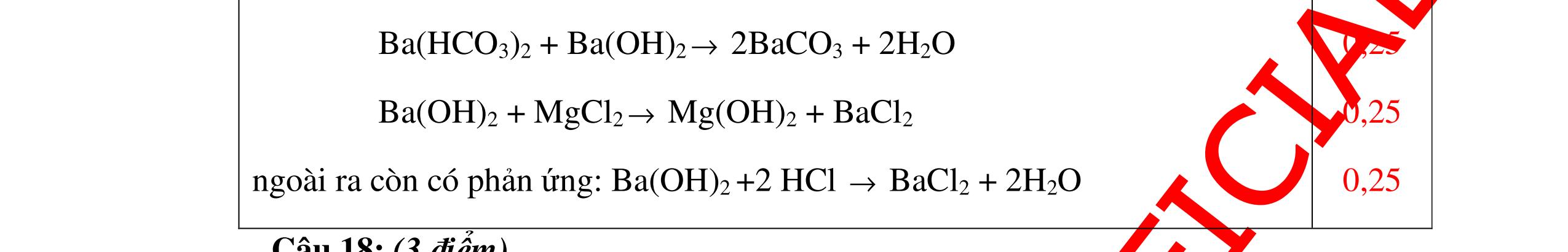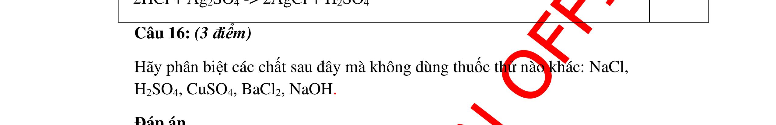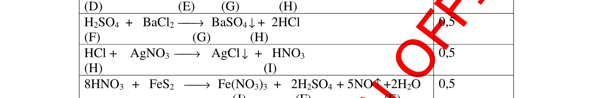 DẠYKÈMQUYNHƠNOFFICIAL 3 2NaOH + CO2 → Na2CO3 + H2O 0.5 4 Mg + 2HCl → MgCl2 + H2 0.5 5 P2O5 + 3H2O → 2H3PO4 0.5 6 CaO + 2 HCl → CaCl2 + H2O 0.5 7 CuSO4 + BaCl2 → BaSO4 + CuCl2 0.5 8 FexOy+ y H2 → x Fe + yH2O 0.5 9 FexOy + 2yHCl → xFeCl2y/x + yH2O 0.5 10 2FexOy + 2yH2SO4 → xFe2(SO4)2y/x + 2yH2O 0,5 Câu 18: (5,0điểm) 1. Cho sơ đồ chuyển hoá sau: Phi kim oxit axit(1) oxit axit(2) axit muối tan muối không tan. a. Tìm công thức các chất thích hợp để thay cho tên các chất trong sơ đồ trên. b. Viết phương trình hoá học biểu diễn chuyển hoá trên. 2. Hoàn thành các phương trình phản ứng sau: FeS + HCl khí A + …. KClO3 + HCl khí B + …. NaHCO3 + HCl khí C + …. 18 a. CT các chất thích hợp: S; SO2; SO3; H2SO4; Na2SO4; BaSO4 0,5 . b. PTPƯ: S + O2 TO SO2 0.5 2SO2 + O2 TO 2SO3 0.5 SO3 + H2O H2SO4. 0.5 H2SO4 + 2NaOH Na2SO4 + 2H2O. 0.5 Na2SO4 + BaCl2 BaSO4 + 2NaCl. 0.5 b.Các phương trình phản ứng