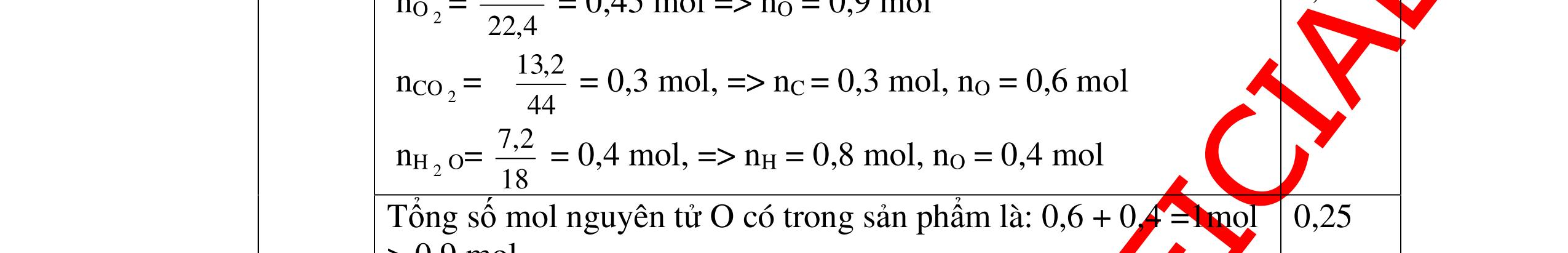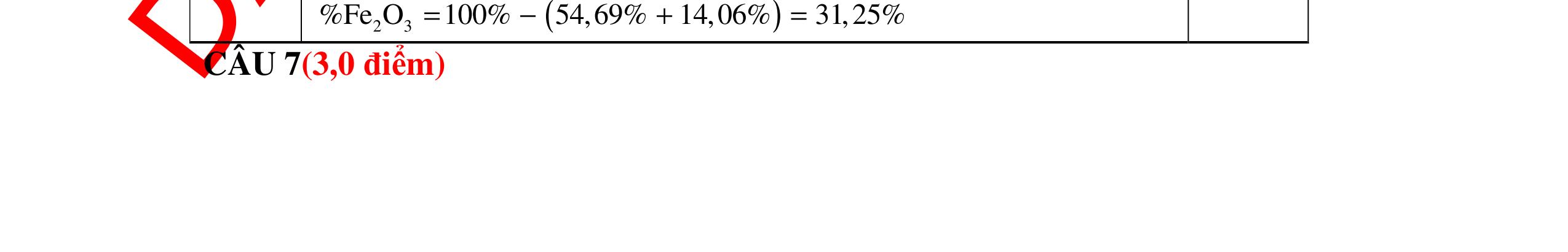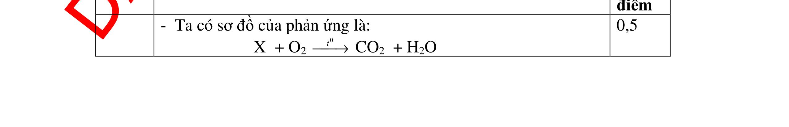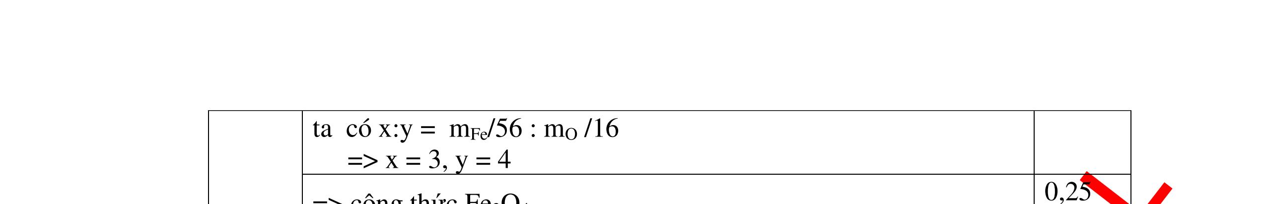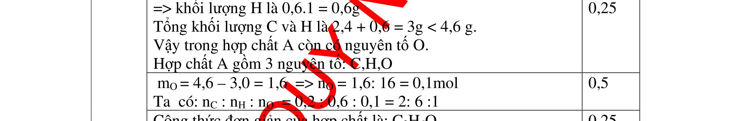 DẠYKÈMQUYNHƠNOFFICIAL => khối luợng O là : 160 – 112 = 48g => nO = 48: 16 = 3 mol Công thức hoá học của hợp chất là: Fe2O3 0,25 0,25 0,25 b) % mC = 3 .100% 31 + = 75 %; % mH = 100% 31 1 + = 25% Gọi công thức dạng chung của hợp chất là CxHy (x,y nguyên, dương) x : y = 75 12 : 25 1 = 1 4 Công thức đơn giản nhất của hợp chất là : CH4 . Vì công thức phân tử cũng chính là công thức đơn giản nên công thức hoá học của hợp chất là CH4 0,5 0,5 0,25