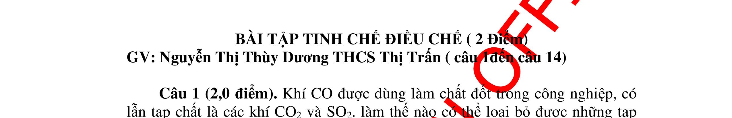 DẠYKÈMQUYNHƠNOFFICIAL CHỦ ĐỀ: ĐIỀUCHẾ CÁCCHẤT(2 điểm) Ngườithựchiện: 1)NguyễnThị ThùyDương-TrườngTHCSTTNậmNhùn(Từ câu1–8) Câu1. Cho các chất Na, H2O, CaCO3, KClO3,P và các điều kiện cần thiết. Viết PTHH để điều chế: NaOH, CO2, O2, H3PO4 Câu Hướng dẫn Điểm 1 * Điều chế NaOH 2Na + 2H2O → 2NaOH + H2 * Điều chế CO2 CaCO3 → 0t CO2 + CaO * Điều chế O2 2KClO3 → 0t 2KCl + 3O2 * Điều chế H3PO4 4 P + 5 O2 → 0t 2P2O5 P2O5 + 3H2O → 2H3PO4 0,5 0,25 0,25 0,5 0,5 Câu2. Từ các hóa chất có sẵn sau đây: Fe ; H2O với các thiết bị cần thiết đầy đủ. Hãy làmthế nào để cóthể thựchiện đượcsự biến đổisau: Fe → Fe3O4 → Fe. Câu Hướng dẫn chấm Điểm 2 - Điều chế H2, O2 bằng cách điện phân nước 0.5 2H2O 2H2 + O2 0.5 - 3Fe + 2O2 Fe3O4 0.5 - Fe3O4 + 4H2 3 Fe + 4H2O 0.5 Câu 3. Cho khí hiđro đi qua các ống mắc nối tiếp, nung nóng, chứa lần lượt các chất: MgO, CaO, CuO, Na2O, P2O5 Câu Hướng dẫn chấm Điểm 3 Dẫn khí H2 đi qua các ống sứ mắc nối tiếp, nung nóng Khí H2 Không phản ứng với MgO; CaO 0,5 Khí H2 tác dụng với CuO H2 + CuO → 0t Cu + H2O 0,5 to to to