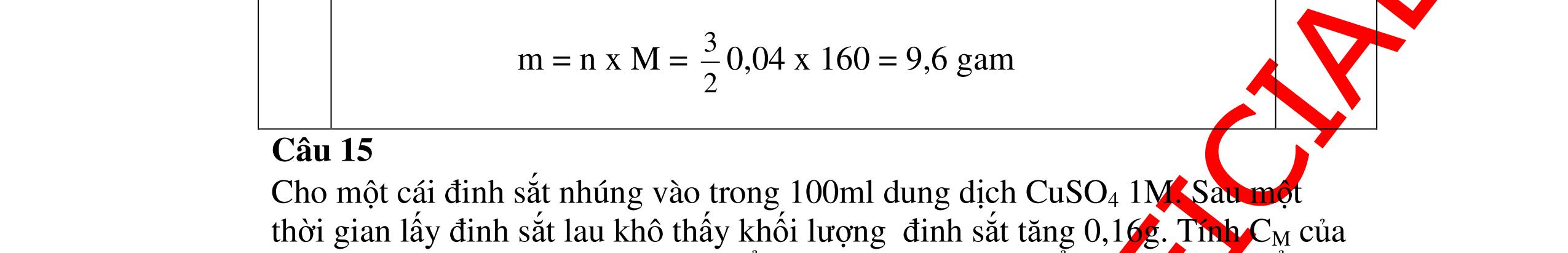 DẠYKÈMQUYNHƠNOFFICIAL 1 1. 4Fe + 3 O2 → 2Fe2O3 2. Fe2O3 + 6HCl→ 2FeCl3 + 3H2O 3. FeCl3 + 3NaOH → Fe(OH)3 ↓ + 3NaCl 4. 2Fe(OH)3 Fe2O3 + 3H2O 5. Fe2O3 + 3 H2 → 2Fe + 3 H2O 0,5đ 0,5đ 0,25đ 0,25đ 0,5đ 2 1. Điều chế CuSO4: Cách 1. Cu + 2H2SO4đđ → CuSO4 + 2H2O + SO2 Cách 2. Cu + O2 CuO CuO + H2SO4 l → CuSO4 + H2O Na2O + H2O → 2NaOH CaO + H2O → Ca(OH )2 Dùng NaOH: CuSO4 + 2NaOH → Cu(OH )2 + Na2SO4 FeCl3 + 3NaOH → Fe(OH )3 + 3NaCl 0,5đ 0,25đ 0,25đ 0,5đ 0,5đ 0,5đ 0,5đ Câu16:Cânbằngcácphươngtrìnhhóahọc 1) MgCl2 + KOH → Mg(OH)2 + KCl 2) Cu(OH)2 + H2SO4 → CuSO4 + H2O 3) Fe2O3 + H2SO4 → Fe2(SO4)3 + H2O 4) Cu(NO3)2 + NaOH → Cu(OH)2 + NaNO3 5) NO + O2 → NO2 6) NO2 + O2 + H2O → HNO3 7) Ca(OH)2 + Na2CO3 → CaCO3 + NaOH 8) Fe2O3 + H2 → Fe + H2O 9) FeI3 → FeI2 + I2 10) AgNO3 + K3PO4 → Ag3PO4 + KNO3 11) SO2 + Ba(OH)2 → BaSO3 + H2O 12) FeS + HCl → FeCl2 + H2S 13) Pb(OH)2 + HNO3 → Pb(NO3)2 + H2O 16 1 MgCl2 + 2KOH → Mg(OH)2 + 2KCl 0,25