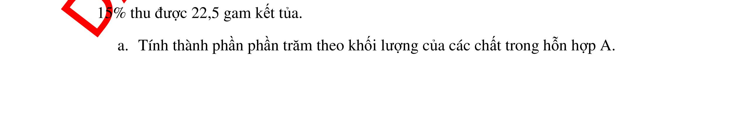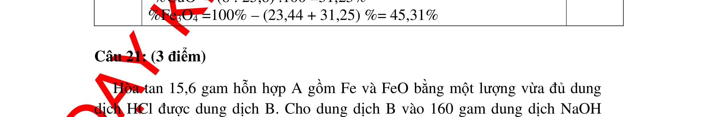 DẠYKÈMQUYNHƠNOFFICIAL 19 Hợp chất A có công thức hóa học dạng chung là SxOy (x, y là số nguyên dương) Khối lượng của hợp chất: mA = 2 + 3 = 5 (gam) → thành phần phần trăm về khối lượng các nguyên tố: %S = .100%40% 5 = %O = 100%60% 5 = Ta có tỷ lệ: y x = 16 60 : 32 40 = 3 1 Chọn x = 1 và y = 3 thế vào công thức dạng chung ta có công thức hóa học là SO3 0,25 0,25 0,5 0,5 0,5 0,5 Câu 20( 2,5): Hỗn hợp gồm Mg và một kim loại hóa trị II tác dụng với HCl thu được 6,72 lit khí (đktc) và 31,7 gam muối khan. Xác định kim loại đó biết số mol kim loại đó bằng ½ số mol của kim loại Mg. Giải: 20 Gọi số mol kim loại Mg là x mol Gọi kim loại hóa trị II là A có số mol là 0,5x mol Mg + 2HCl →MgCl2 + H2 xmol x mol x mol A + 2HCl →ACl2 + H2 0,5x mol 0,5x mol 0,5x mol Số mol H2: x+0,5x = 6,72/22,4 x= 0,2 mol Khối lượng của muối: 95x+ (A+71).0,5.x =31,7 Thay x= 0,2 giải ra ta có: A= 56 Kết luận : A là kim loại sắt (Fe) 0,5 0,5 0,5 0,5 0,5 Câu 21: ( 2,5đ) Hợp chất A chứa 3 nguyên tố Ca, C, O với tỉ lệ Ca chiếm 40%, C: 12%, O: 48% về khối lượng. Tìm công thức về khối lượng.