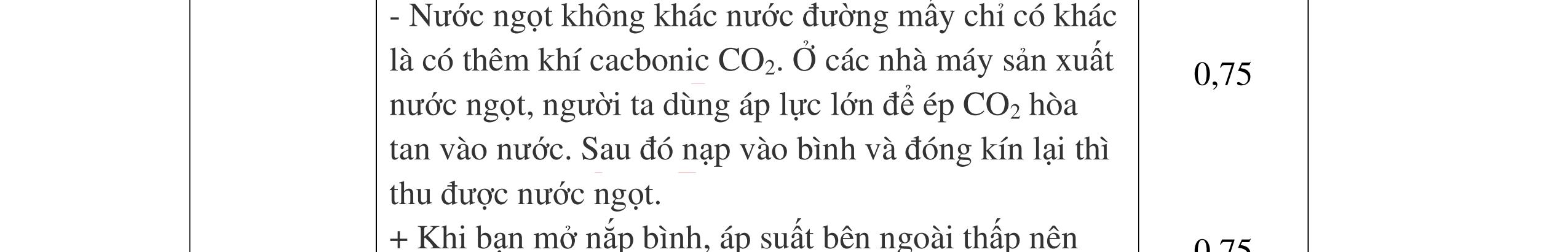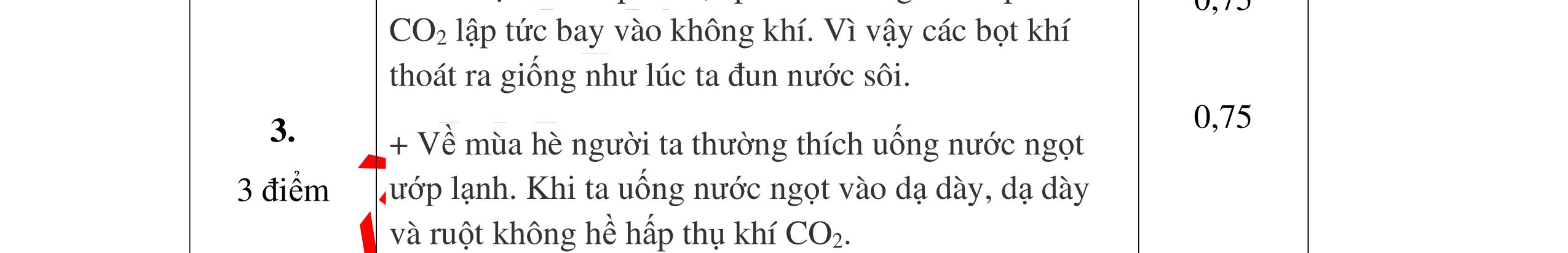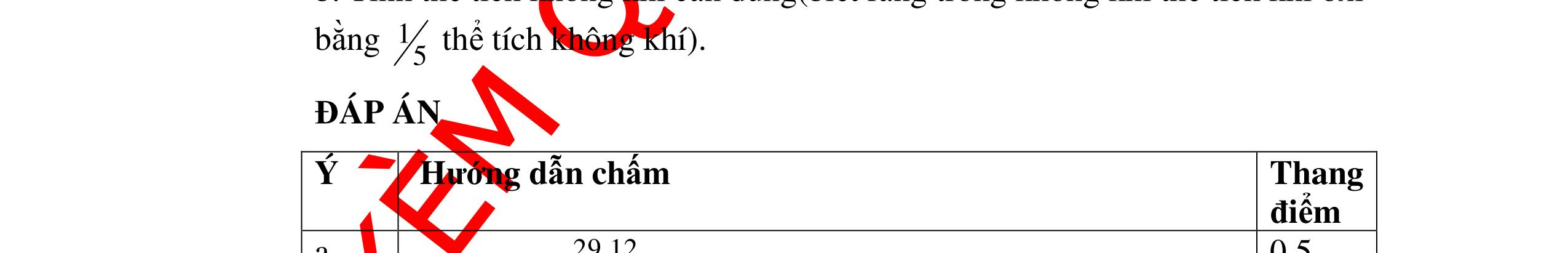 i sinh ra năng lượng để duy trì sự sống của cơ thể. 0,5 0,75 0,75 Câu 20: Trong các lễ hội, em thường thấy các trường thả bóng. Những quả bóng đó có thể bơm bằng khí gì? Em hãy giải thích vì sao sau khi bơm các khí đó thì quả bóng bay lên được, còn bơm không khí thì bóng không bay được? 20. 2 điểm Những quả bóng có thể được bơm bằng khí hiđro. 2 21 2915H kk d =≈ Khí hiđro nhẹ hơn xấp xỉ bằng 1 15 không khí nên bóng bay được. 0,75 0,75 0,5