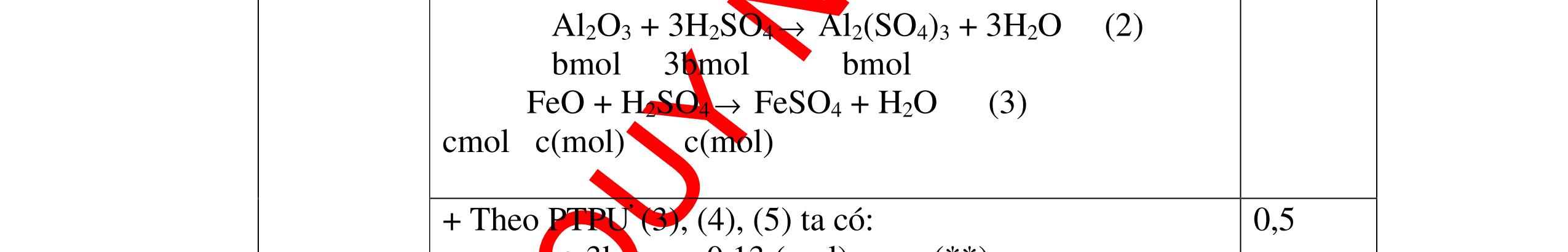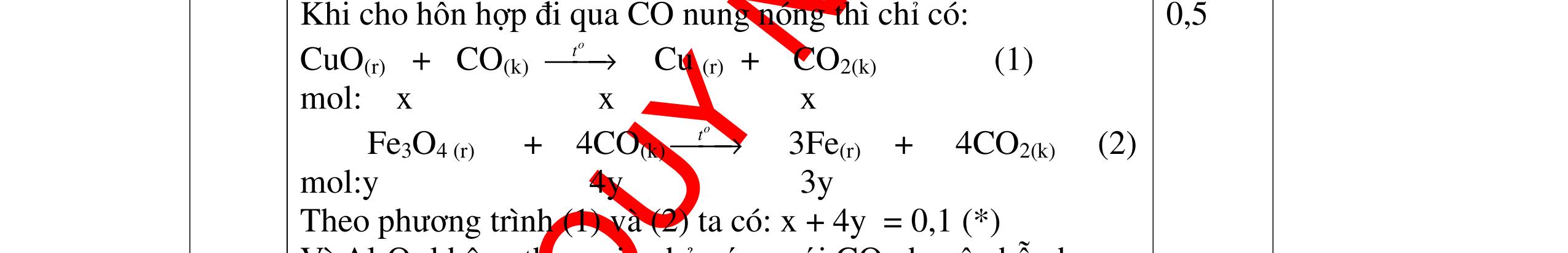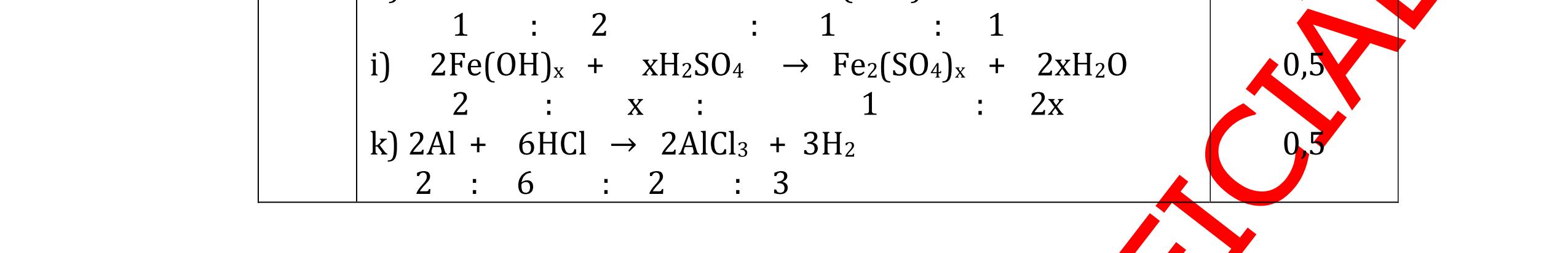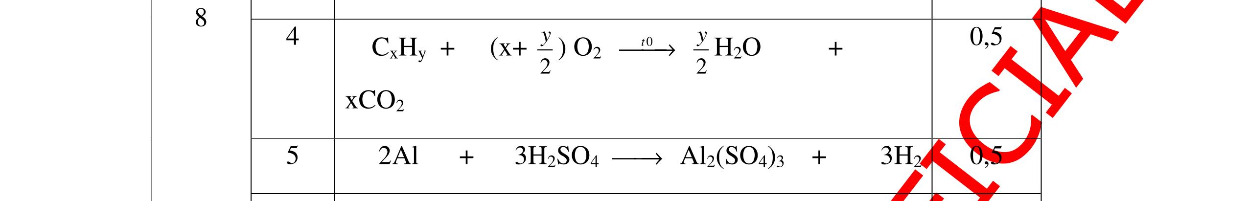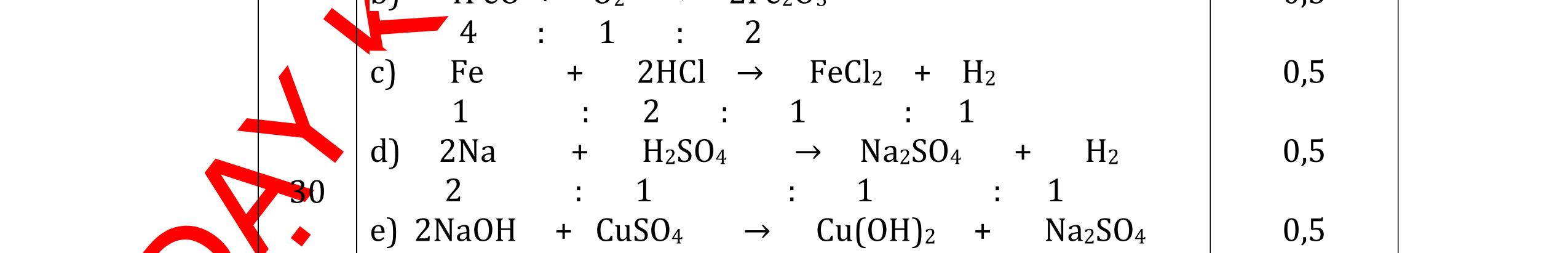 DẠYKÈMQUYNHƠNOFFICIAL 5 2SO2 +O2 xt,to 2SO3 0.25 6 SO3 + 2H2O → H2SO4 0.25 7 2H2SO4đặc +Cu to CuSO4 +SO2+2H2O 0.25 Câu21:(5điểm): Hoànthànhphươngtrìnhphảnứngsauvàchobiếttỉlệ sốnguyêntử,sốphântửcácchất? a. FeS2 + O2 ------>Fe2O3 + SO2 b. Al(OH)3 ------>H2O + Al2O3 c. FexOy + CO------> Fe + CO2 d. CxHy + O2 ------> H2O + CO2 e. Al + H2SO4 ------> Al2(SO4)3 + H2 f. P + O2 ------> P2O5 g.Na + H2O ------> NaOH + H2 h.Al + Cl2 ------>AlCl3 i. KClO3 ------>KCl + O2 k.KMnO4 ------>K2MnO4 +MnO2 +O2 Câu Hướngdẫnchấm Biểuđiểm 21 a. 4FeS2 + 11O2 0t → 2Fe2O3 + 8SO2 4 : 11 : 2 : 8 b. 2Al(OH)3 → 3H2O + Al2O3 2 : 3 : 1 c. FexOy + yCO 0t → xFe + yCO2 1 : y : x : y d. CxHy + (x+ 2 y )O2 0t → 2 y H2O + xCO2 1 : (x+ 2 y ) : 2 y : x e. 2Al + 3H2SO4 → Al2(SO4)3 + 3H2 2 : 3 : 1 : 3 f. 4P + 5O2 → 2P2O5 4 : 5 : 2 g.2Na + 2H2O → 2NaOH + H2 2 : 2 : 2 : 1 h.2Al + 3Cl2 → 2AlCl3 2 : 3 : 2 i. 2KClO3 0t → 2KCl + 3O2 2 : 2 : 3 k.2KMnO4 →K2MnO4+MnO2+O2 2 : 1 : 1 : 1 0,5 0,5 0,5 0,5 0,5 0,5 0,5 0,5 0,5 0,5