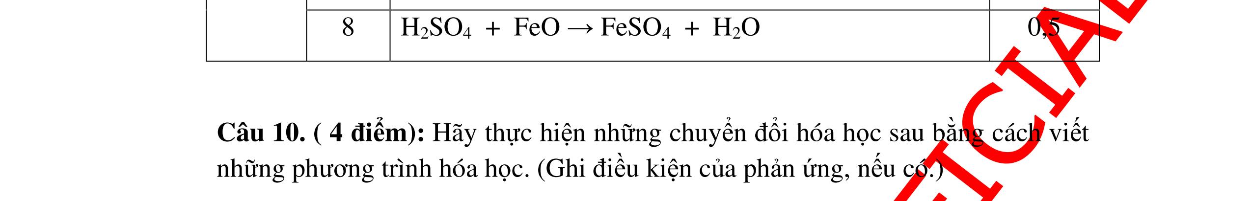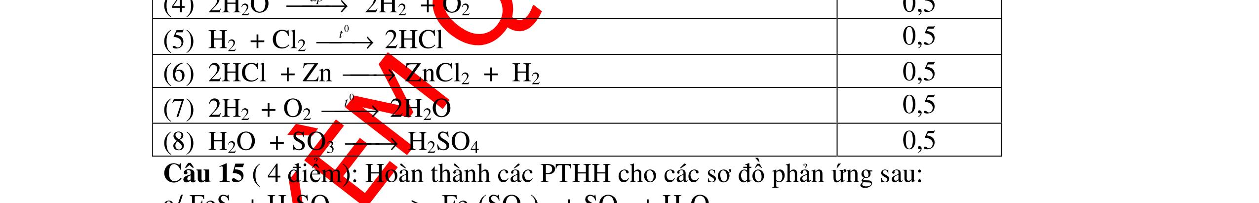 DẠYKÈMQUYNHƠNOFFICIAL (5 đ) (3) Fe(OH)2 + 2HCl → FeCl2 + 2H2O (4) 2Fe + 3Cl2 ot → 2FeCl3 (5) FeCl3 + 3NaOH → Fe(OH)3↓ + 3NaCl (6) 2Fe(OH)3 ot → Fe2O3 + 3H2O (7) 2FeCl2 + Cl2 → 2FeCl3 (8) 2FeCl3 + Fe → 3FeCl2 (9) 4Fe(OH)2 + 2H2O + O2 → 4Fe(OH)3 ↓ đúng 0,5 điểm 1. Fe + 2HCl → FeCl2 + H2 0,25 2. 2H2O ot → 2H2 + O2 0,25 Câu10:5 đ a. Lập phương trình hóa học theo các sơ đồ sau: 1/ FeS2 + O2 ----> Fe2O3 + SO2 2/ KOH + Al2(SO4)3 ----> K2SO4 + Al(OH)3 3/ FexOy + CO ----> FeO + CO2 4/ Al + Fe3O4 ----> Al2O3 + Fe b.Viết phương trình hóa học thực hiện chuyển đổi hóa học sau: S 1 SO2 SO3 H2SO4 H2 Cu c.Viết phương trình hóa học xảy ra, kèm theo điều kiện (nếu có) khi: Điều chế khí oxi từ kali clorat, kali pemanganat, nước. Cho khí oxi tác dụng lần lượt với khí metan, phốt pho, sắt. Câu Đápán Điểm 10 a 1) 4FeS2 + 11O2 2Fe2O3 + 8 SO2 2) 6KOH + Al2(SO4)3 3K2SO4 + 2Al(OH)3 3) FexOy + (y-x)CO xFeO + (y-x)CO2 4) 8Al + 3Fe3O4 4Al2O3 +9Fe 0,5 0,5 0,5 0,5 b Viết phương trình hóa học: S + O2 SO2 2SO2 + O2 2SO3 SO3 + H2O H2SO4 H2SO4 + Zn ZnSO4 + H2 H2 + CuO Cu + H2O 0,25 0,5 0,25 0,25 0,25 1 2 53 4