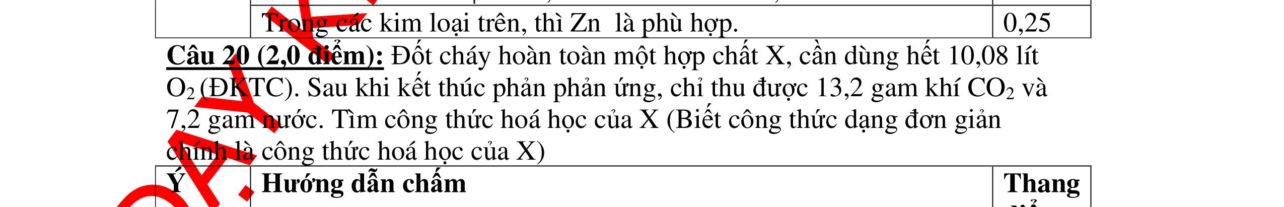 DẠYKÈMQUYNHƠNOFFICIAL PTHH: R + mHCl → RClm + m 2 H2 ↑ 1 m m 2 0,5 Theo PTHH: nR= 2Hn m 2 = 2.0,2 m => nR 0,4 = m 0,25 → R R m 11,2 R===28m n0,4 m => R = 28m 0,5 Với các giá trị của n, ta có giá trị R tương ứng như sau: m 1 2 3 R 28 56 84 0,25 Giá trị thích hợp là n=2 R=56 0,25 → Kim loại Sắt (Fe) 0,25 Câu 18 (2,5) Phân tích một hợp chất X , người ta thấy thành phần khối lượng của nó có 30,4 % là Nitơ và 69,6% là Oxi . Viết CTHH của hợp chất? 18 Gọi công thức của hợp chất là: NxOy Ta có x: y = 30,4 : 14 : 69,6 :16 = 2,171 : 4,35 Số nguyên tử N : Số ngtử O = 1 : 2 Vậy PTHC X có 1 ngtử N và 2 ngtử O CTHC là : NO2 0,5đ 1đ 0,5 0,5đ Câu 19( 2,5) Trong hợp chất oxit của lưu huỳnh có chứa 2 gam lưu huỳnh và 3 gam oxi Tìm công thức hóa học đơn giản nhất của hợp chất