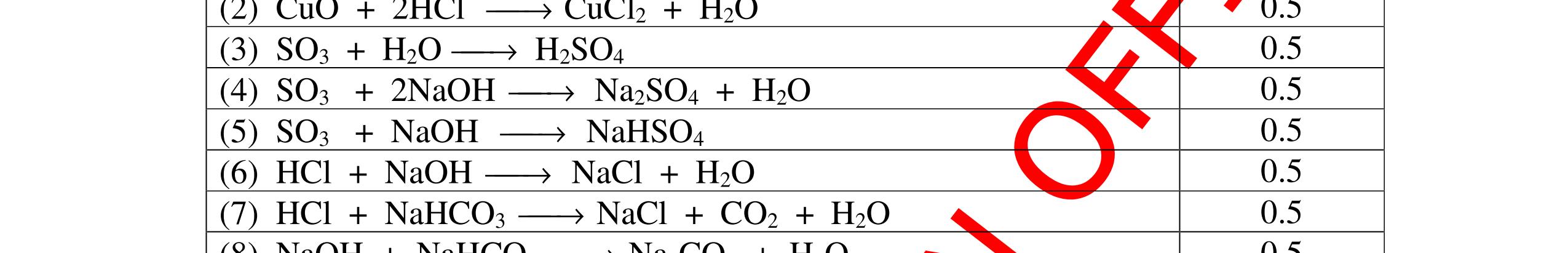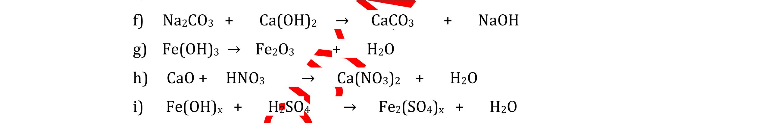 DẠYKÈMQUYNHƠNOFFICIAL 2 Cu(OH)2 + H2SO4 → CuSO4 + 2H2O 0.25 3 Fe2O3 + 3H2SO4 → Fe2(SO4)3 + 3H2O 0.5 4 Cu(NO3)2 + 2NaOH → Cu(OH)2 + 2NaNO3 0.5 5 2NO + O2 → 2NO2 0.25 6 4NO2 + O2 + 2H2O → 4HNO3 0.25 7 Ca(OH)2 + Na2CO3 → CaCO3 + 2NaOH 0.25 8 Fe2O3 + 3H2 → 2Fe + 3H2O 0.5 9 2FeI3 → 2FeI2 + I2 0.5 10 3AgNO3 + K3PO4 → Ag3PO4 + 3KNO3 0,5 11 SO2 + Ba(OH)2 → BaSO3 + H2O 0,5 12 FeS + 2HCl → FeCl2 + H2S 0,25 13 Pb(OH)2 + 2HNO3 → Pb(NO3)2 + 2H2O 0,5 Câu17:Chọnhệ số vàcôngthứchóahọcphùhợp điềnvàodấuhỏichấm trongphươngtrìnhhóahọc 1) Al2O3 + ? → AlCl3 + H2O 2) H3PO4 + KOH → K3PO4 + ? 3) ?NaOH + CO2 → Na2CO3 + ? 4) Mg + HCl → ? + H2 5) P2O5 + ? → ?H3PO4 6) CaO + ? → CaCl2 + H2O 7) CuSO4 + BaCl2 → BaSO4 + ? 8) FexOy+ H2 → Fe + H2O 9) FexOy + HCl → FeCl2y/x + H2O 10) FexOy + H2SO4 → Fe2(SO4)2y/x + H2O 17 1 Al2O3 + 6 HCl → 2AlCl3 + 3 H2O 0,5 2 H3PO4 + 3KOH → K3PO4 + 3H2O 0.5
