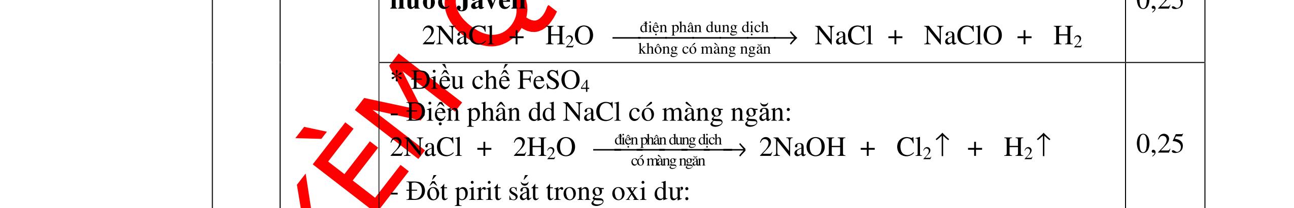 DẠYKÈMQUYNHƠNOFFICIAL - Điện phân dung dịch nước biển không có màng ngăn thu được nướcJaven: 2NaCl + H2O ®iÖn ph©n dung dÞch kh«ng cã mµng ng¨n → NaCl + NaClO + H2 0,25 - Đốt pirit sắt trong oxi dư: 4FeS2 + 11O2 ot → 2Fe2O3 + 8SO2 ↑ - Dẫn H2 dư qua Fe2O3 nung nóng: 3H2 + Fe2O3 ot → 2Fe + 3H2O - Đốt sắt trong khí clo thu được FeCl3: 2Fe + 3Cl2 ot → 2FeCl3 - Đốt khí SO2 trong không khí với chất xúc tác V2O5: 2SO2 + O2 o 25 t VO → 2SO3 - Sục khí SO3 thu được vào nước: SO3 + H2O → H2SO4 - Cho dung dịch thu được phản ứng với sắt dư thu được FeSO4: Fe + H2SO4 → FeSO4 + H2 ↑ 0,25 0,25 0,25 0,25 0,25 0,25