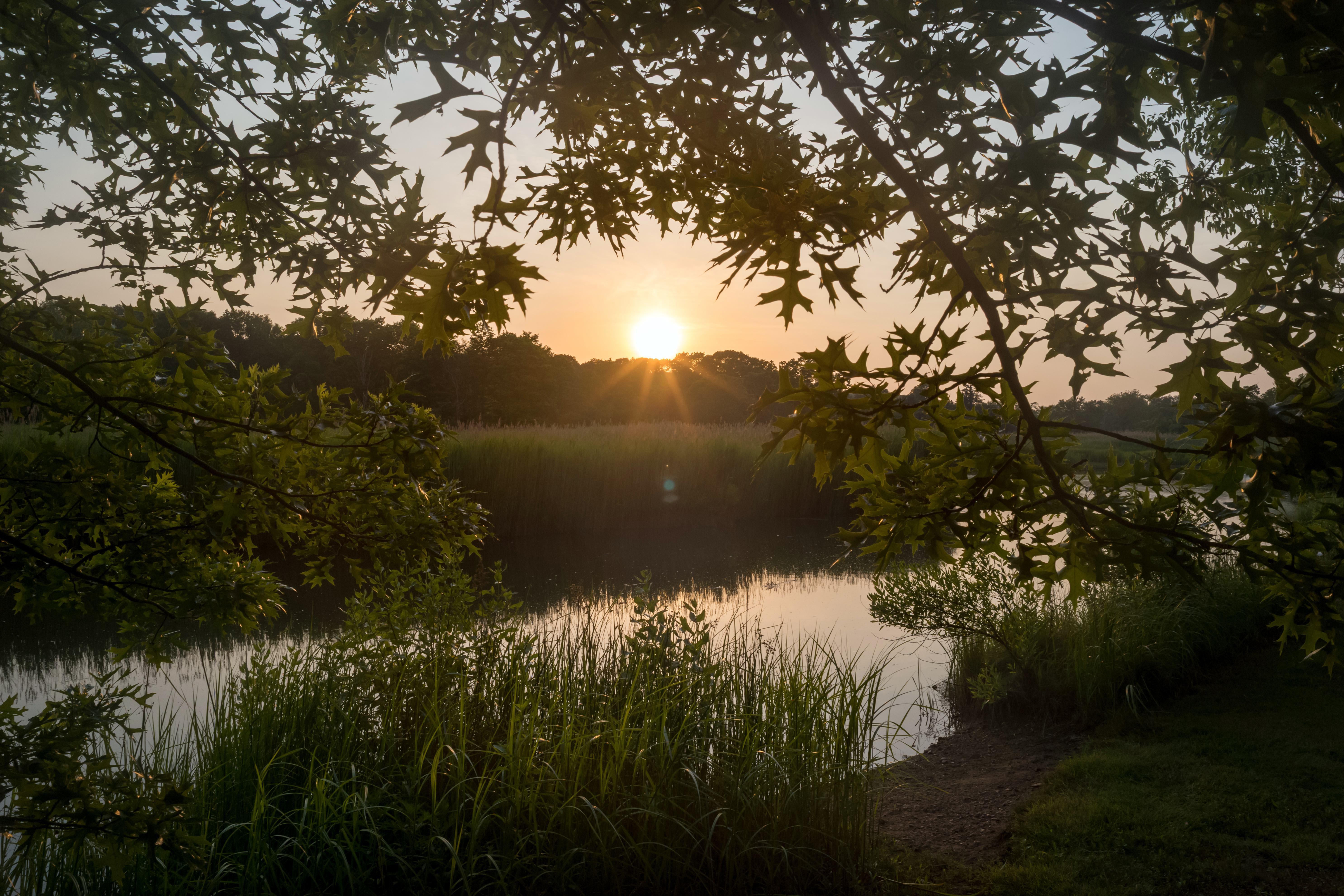 The sun sets over the West River and surrounding salt marshes as viewed from the Olmstead Outlook on June 23. The scenic overlook recently reopened to the public following the 2024 seawall restoration project.