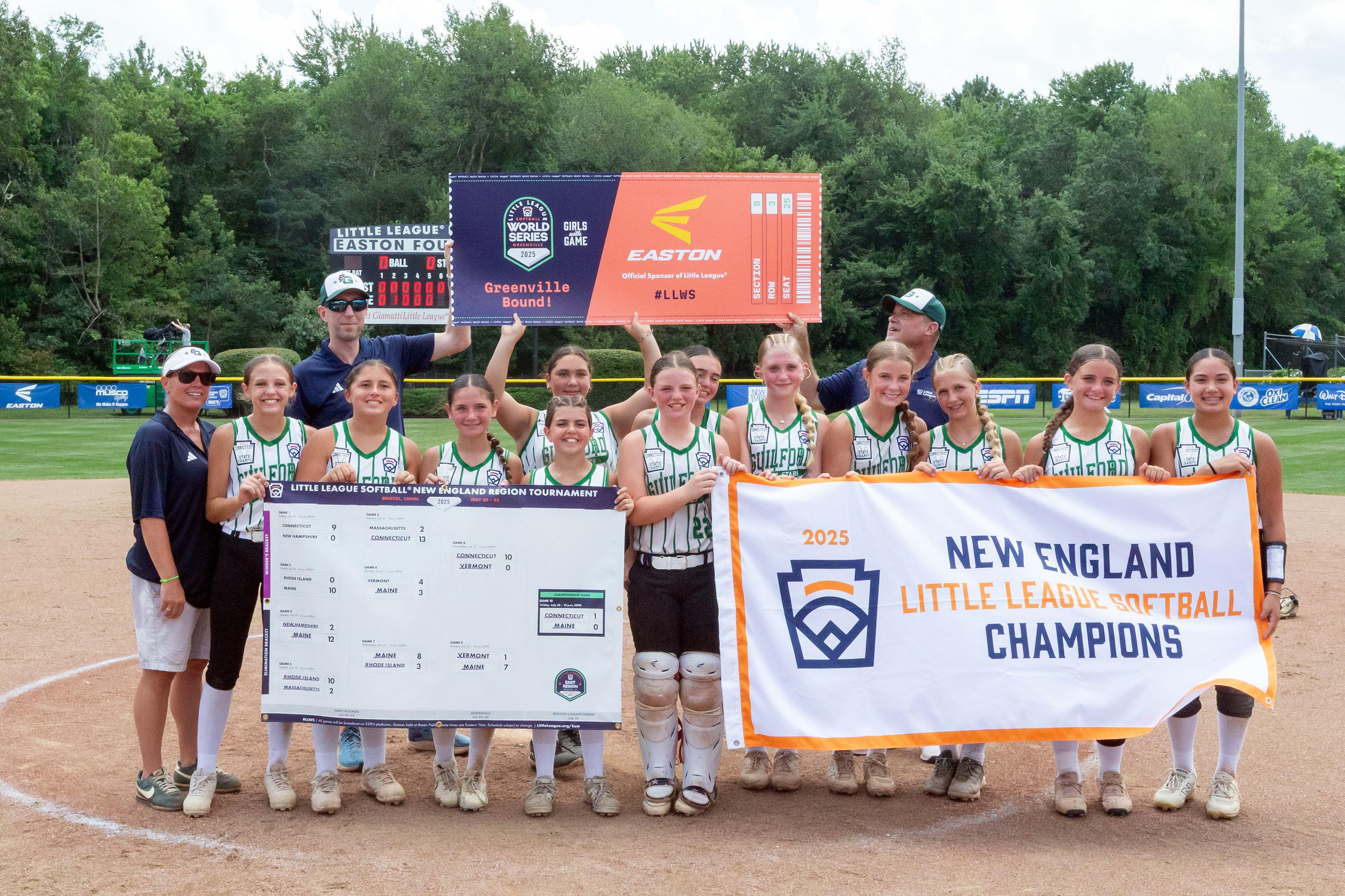 Guilford Little League celebrates after clinching the New England title with a 1–0 win over Maine on July 25 at the A. Bartlett Giamatti Little League Complex in Bristol. With the shutout victory, Connecticut’s state champions advance to the Little League Softball World Series in Greenville, South Carolina, where they will face the MidAtlantic champions in their opening game on Aug. 3.