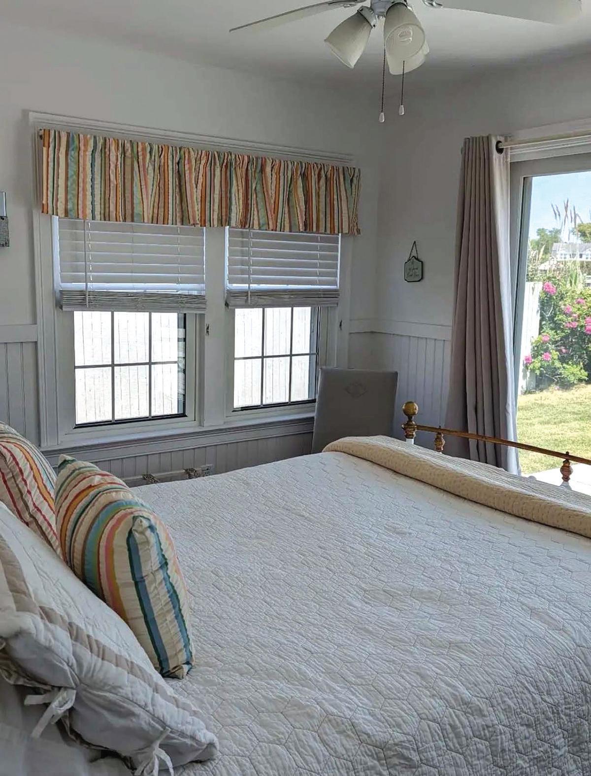 The light-filled bedroom features a slider to the deck for seamless indoor-outdoor living, plus double windows, a ceiling fan, and coastal details.
