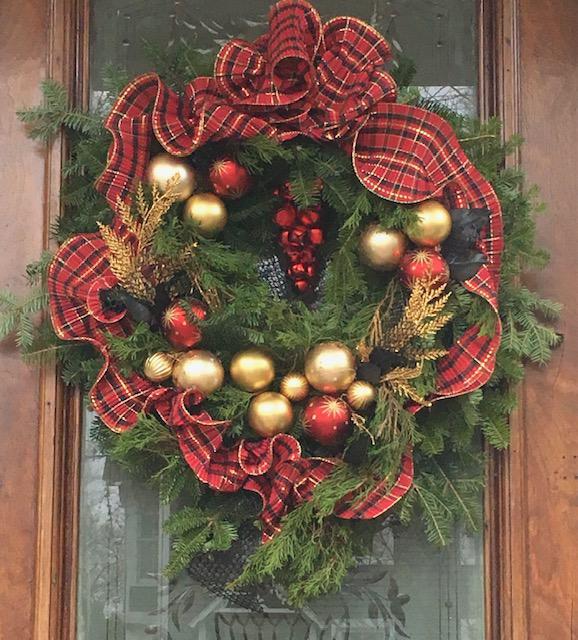 A door on Broad Street is adorned with a wreath decorated by the Guilford Garden Club