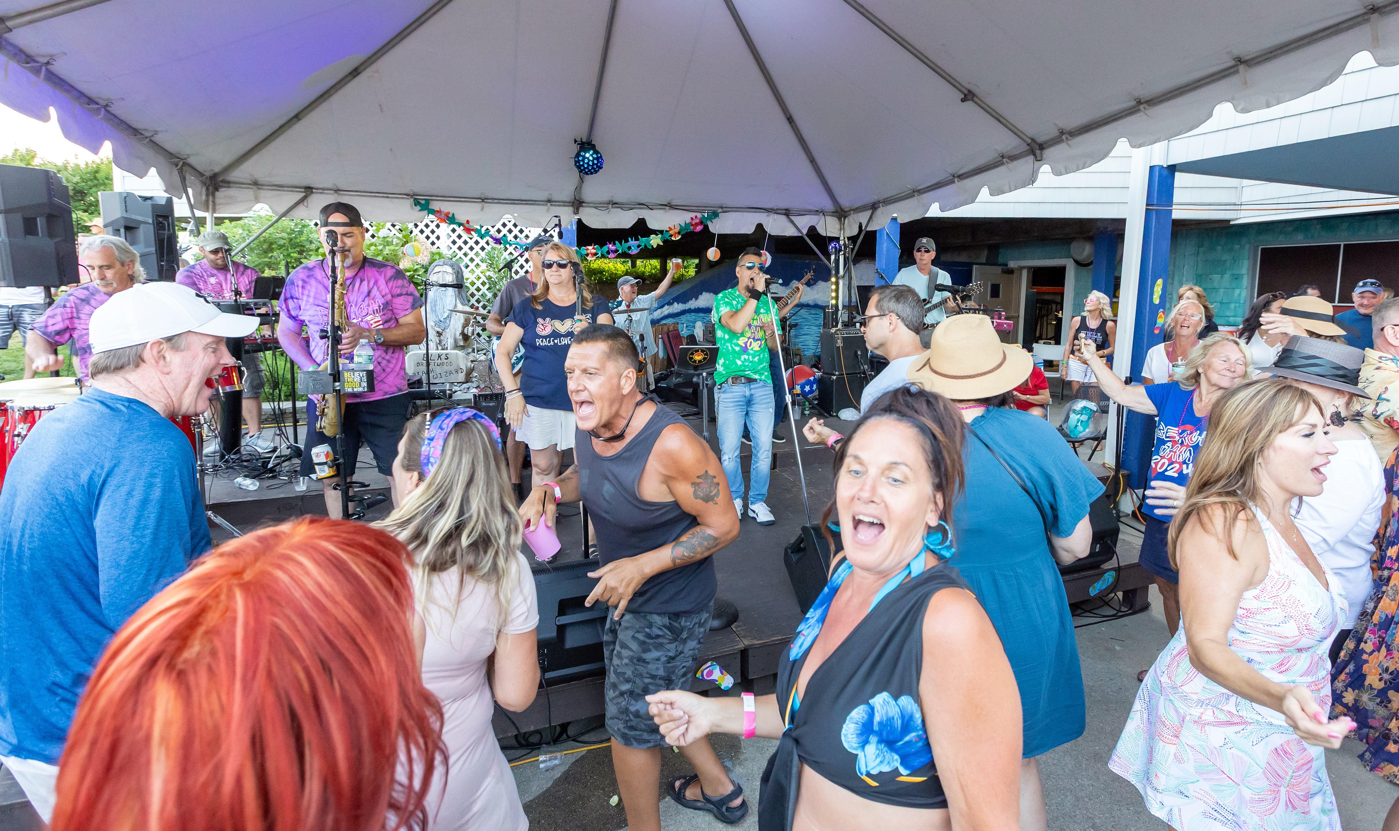Guests dance to live music during the 16th annual “Sweet 16” Beach Jam fundraiser at the Westbrook Elks Lodge on Aug. 9. The sold-out event has raised nearly $625,000 over 16 years to help cancer patients pay for expenses not covered by insurance, with organizers hoping to reach $700,000 this year. The all-day festival featured 12 musical acts on two stages, a silent auction, raffles and familyfriendly activities.