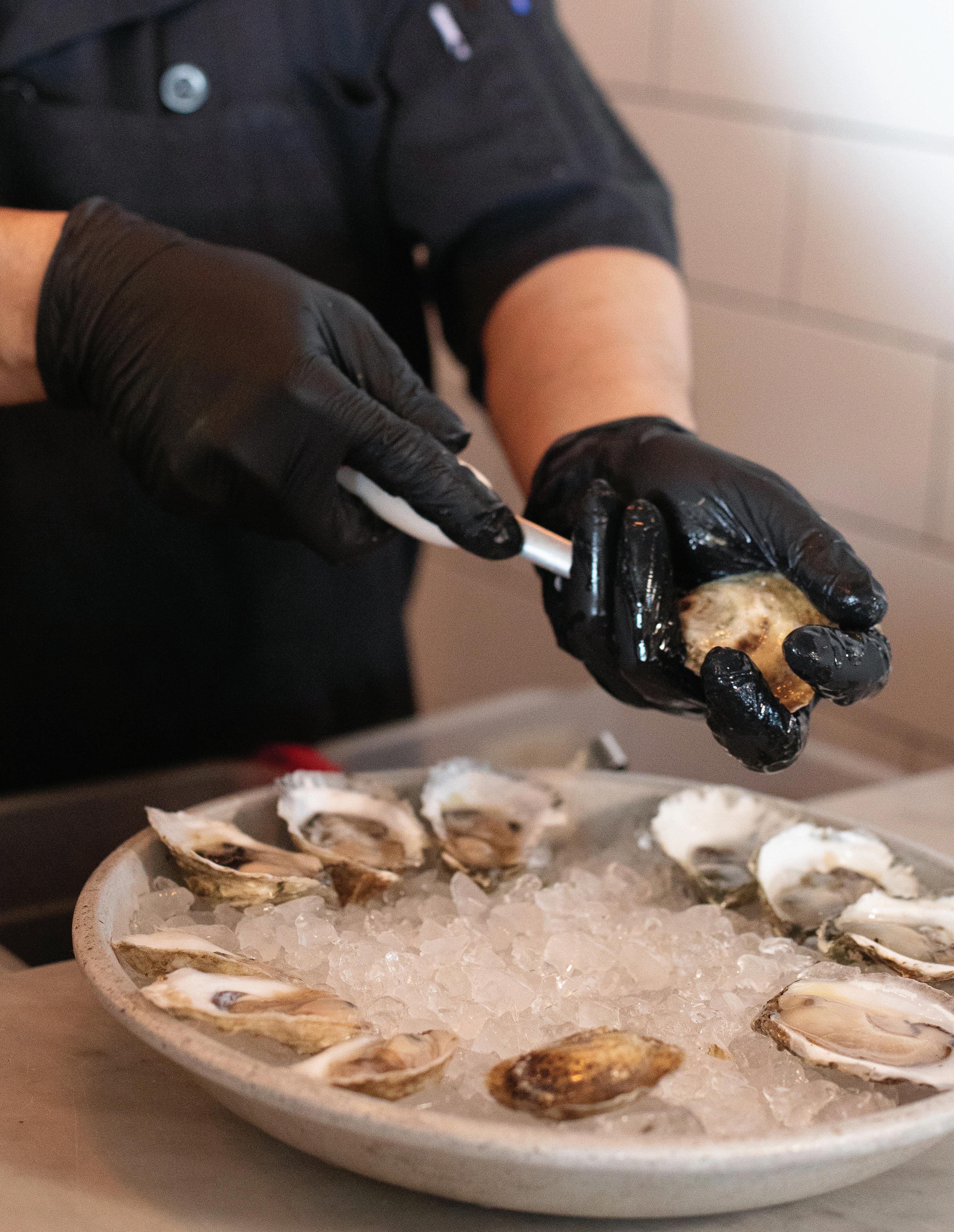 LEFT Chef shucking oysters at Shell & Bones Oyster Bar and Grill in New Haven.
