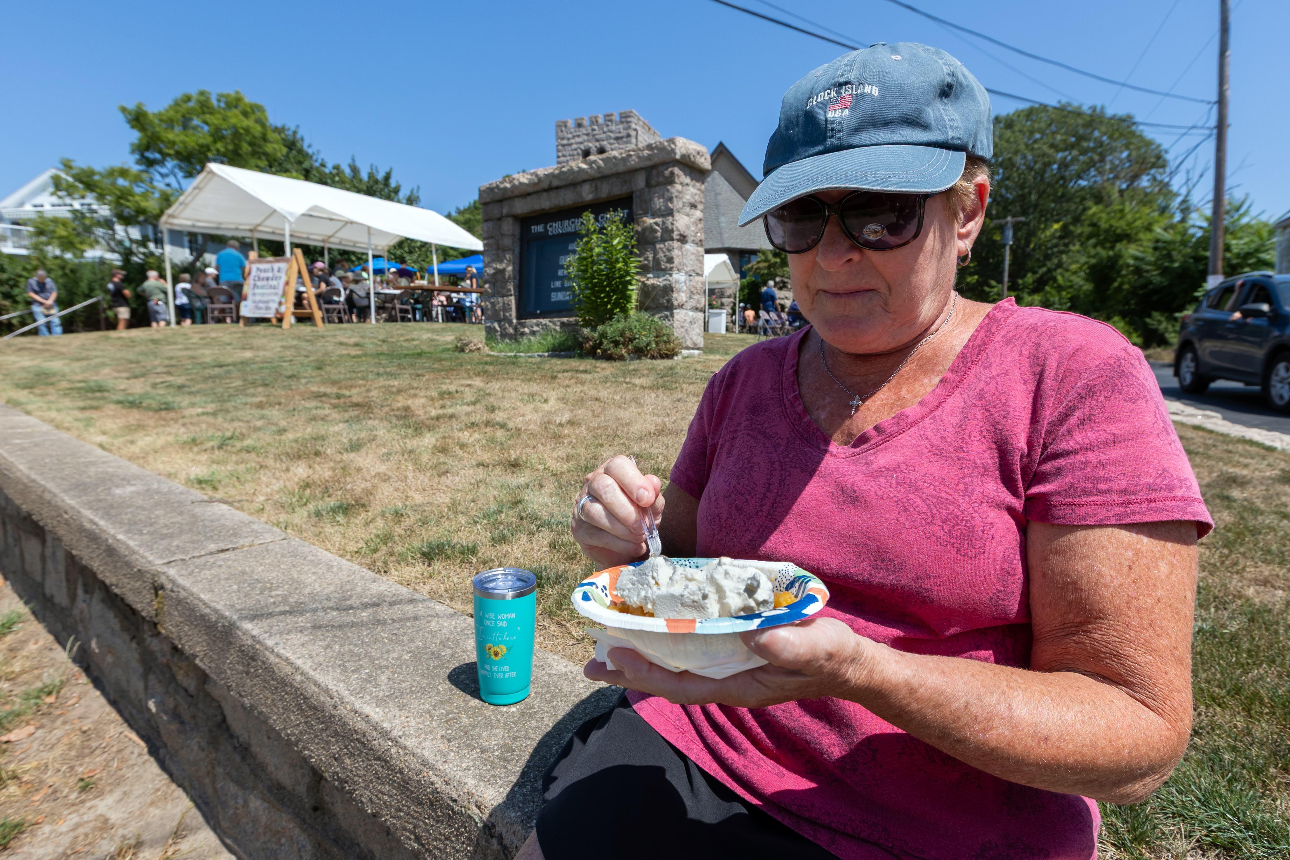 Maureen Donnelly enjoys peach shortcake while taking in the view of the beach outside Stony Creek Congregational Church on Aug. 9.