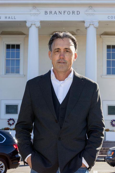 Newly elected Branford First Selectman Josh Brooks poses outside of Branford Town Hall on Nov. 14.