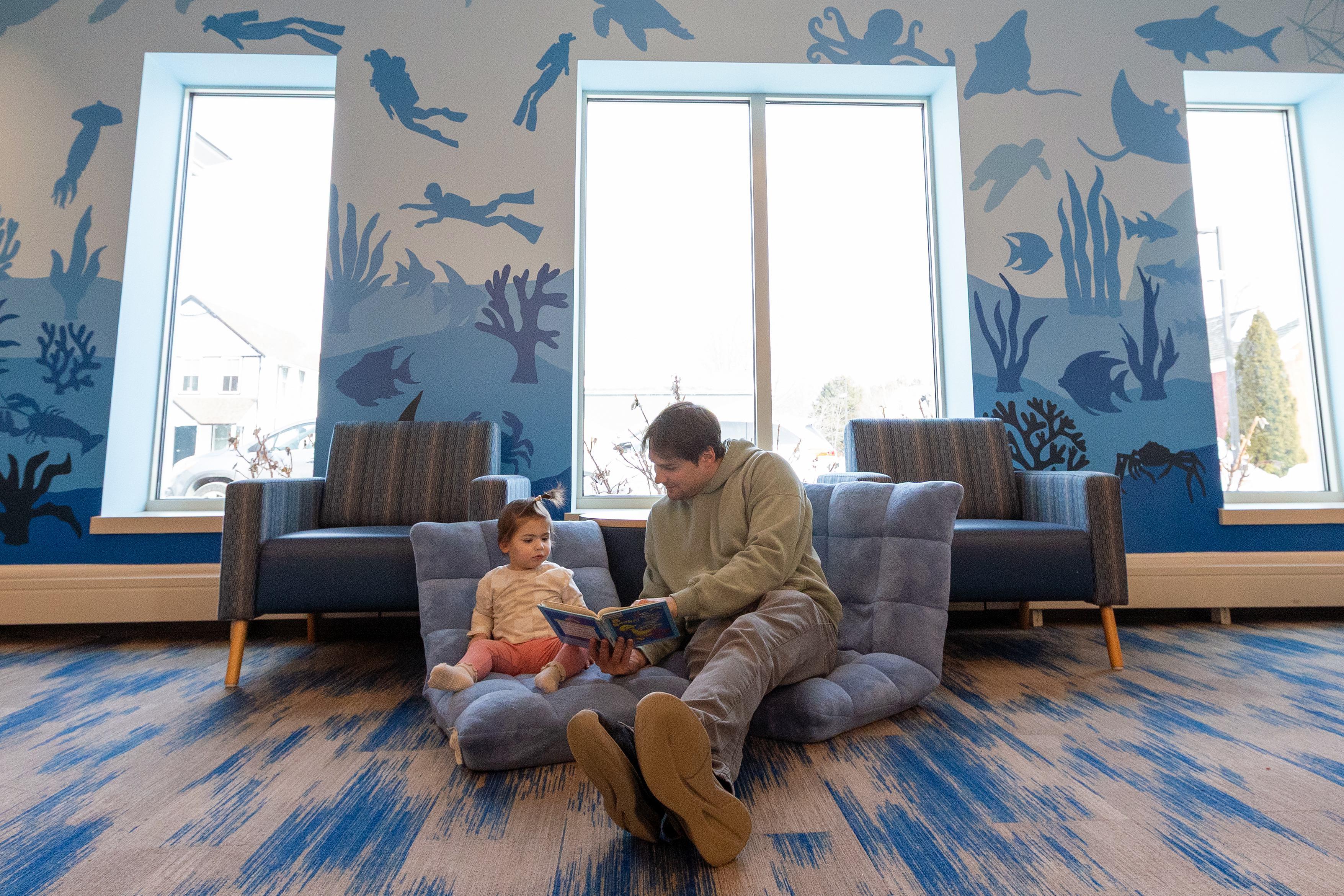 David Lefkin reads to his 1-yearold daughter, Harper, at the E.C. Scranton Memorial Library in Madison on Feb. 10. A new children’s room mural by retired Madison art teacher Kristen Cafferty is visible behind them.