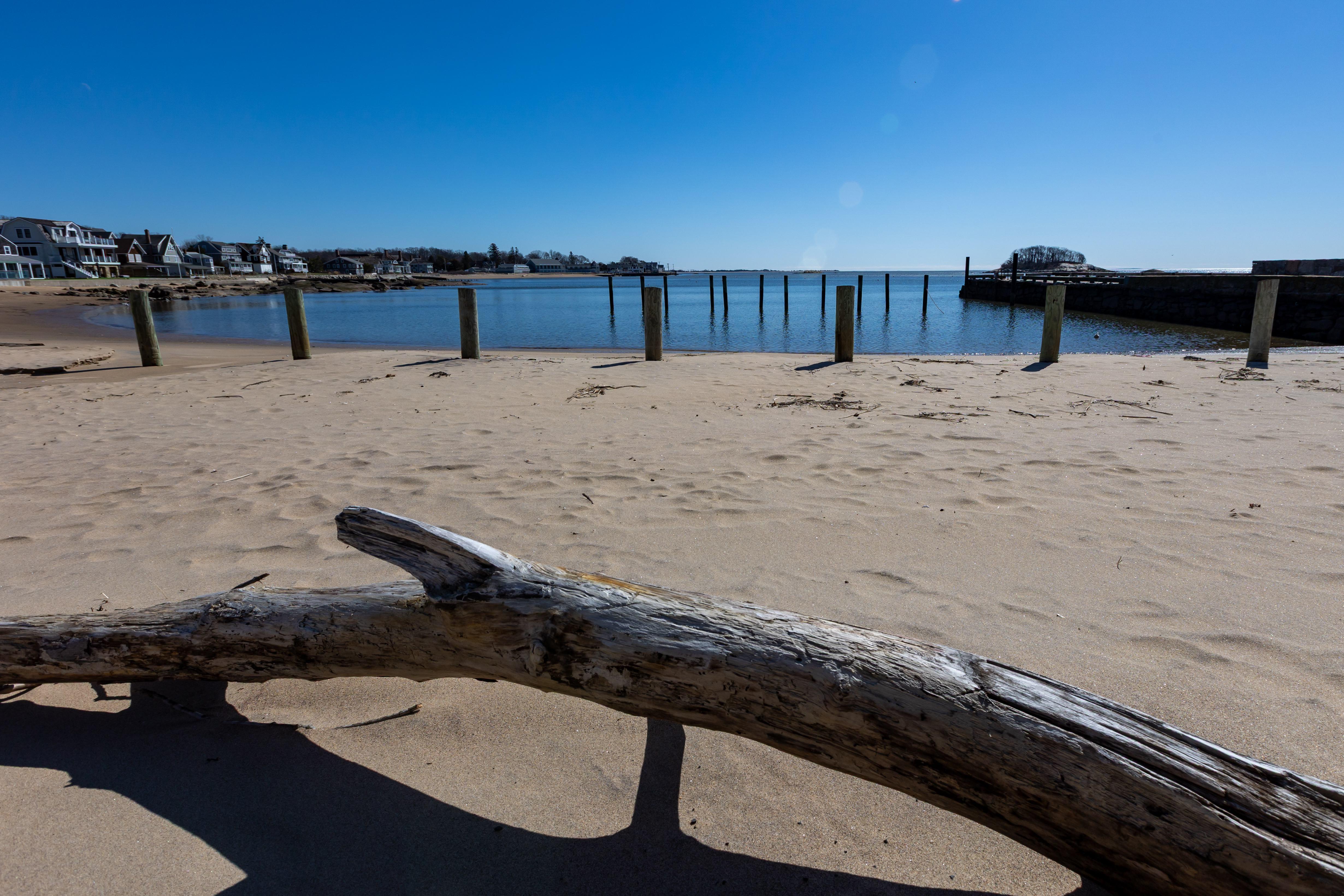 A driftwood log rests on the sand at West Wharf in Madison on March 24 during a sunny, breezy early spring day.