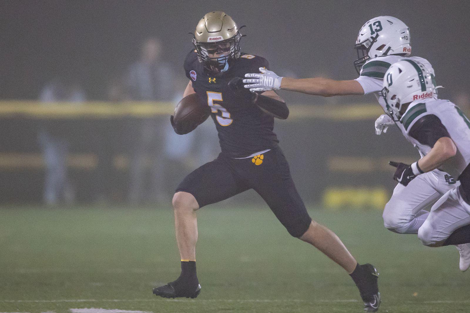 Members of the Hand High football team come onto the field at the beginning of their game against Guilford, an easy 41-3 victory that propelled them into the playoffs.