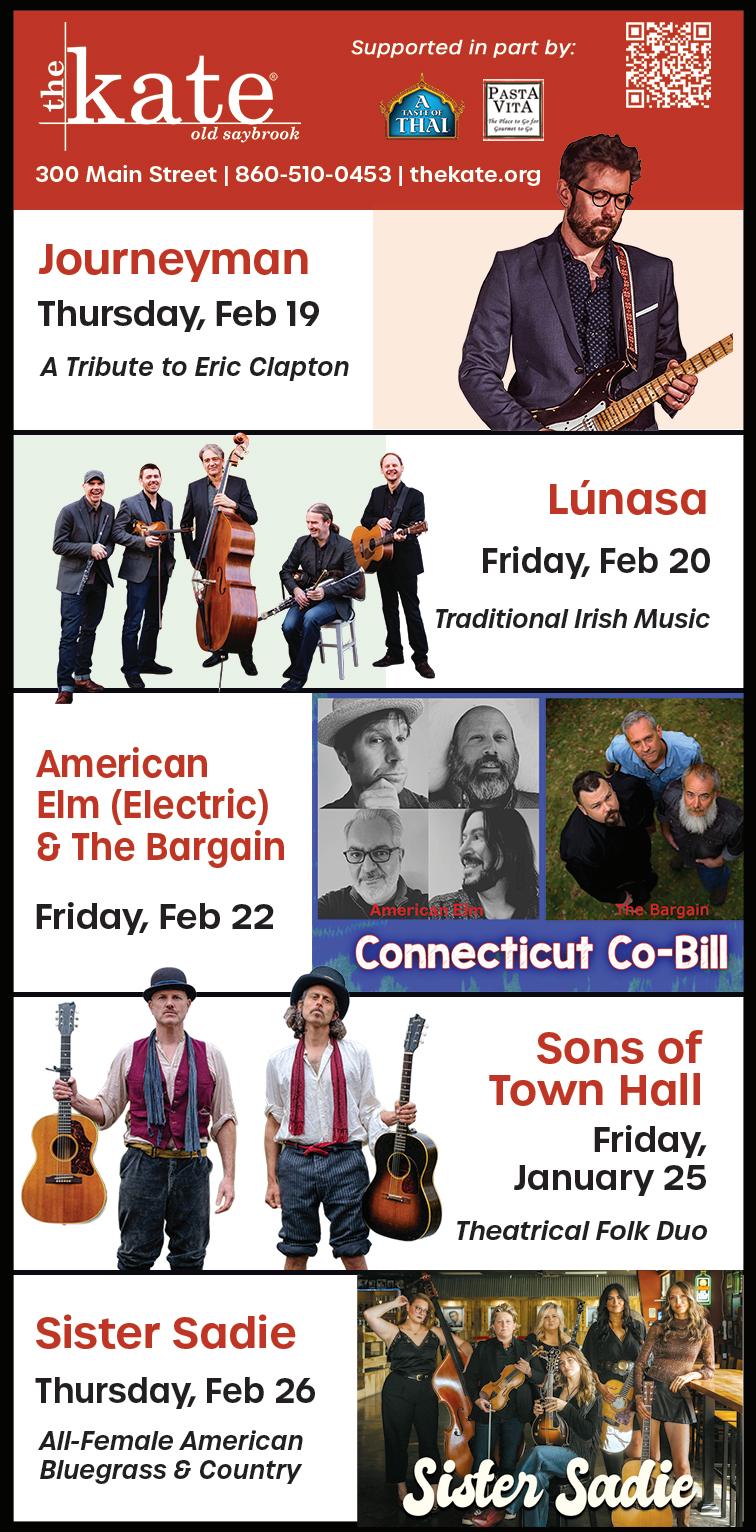 : 7:30 p.m. The Katharine Hepburn Cultural Arts Center, 300 Main St., Old Saybrook. For info or tickets, call 860510-0453 or visit thekate.org. : 7 p.m. Madison Beach Hotel, 94 W. Wharf Rd., Madison. Features a multicourse Mardi Gras–inspired dinner with wine pairings and live blues by Paul Gabriel. Cost: $150. For info or reservations, visit madisonbeachhotel-curio.eventbrite.com or madisonbeachhotelevents.com/hotel/ hotel-happenings.