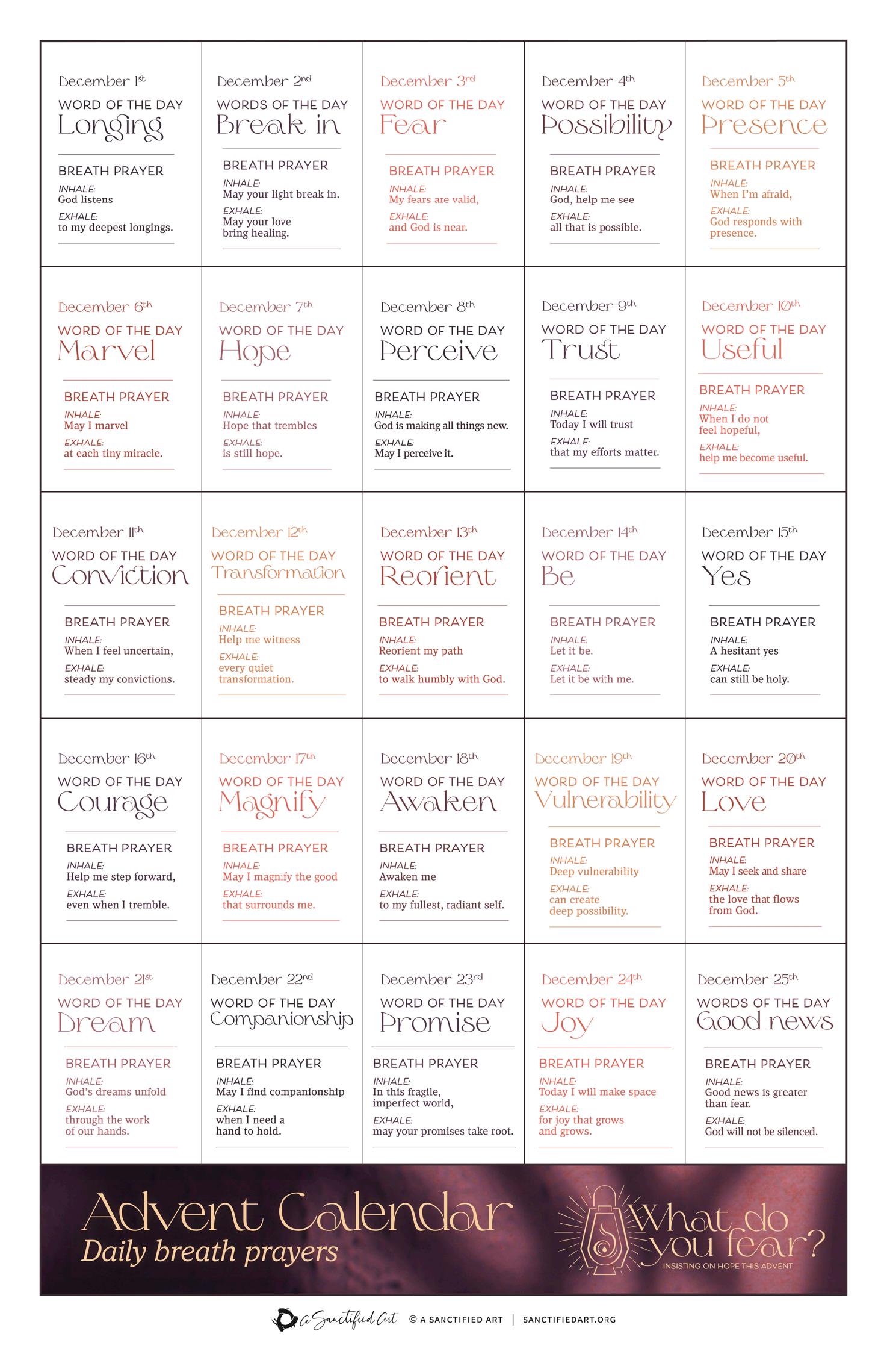 Our Advent Study also includes a simple, family-friendly coloring calendar and a daily breathprayer calendar for December 1–25, each prayer inspired by a single word or phrase (see page 33). Our 9 a.m. weekday Morning Meditations will follow these same themes, creating a meaningful rhythm of reflection throughout Advent. Please contact the church office for any of these resources.
