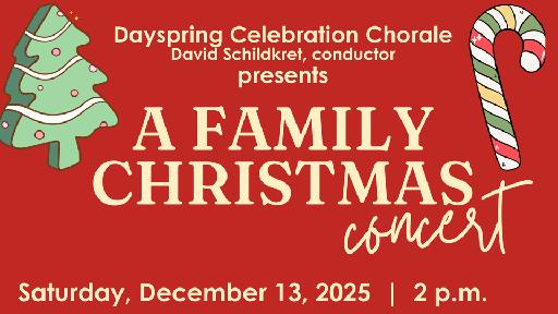 On December 13 at 2 p.m., the Dayspring Celebration Chorale will perform a special concert of Christmas favorites. “A Family Christmas” offers fun for young and old as we sing familiar carols, culminating in a sing-along. The program features The Many Moods of Christmas, Suite 3 (“What Child is This?” “Hark, the Herald Angels Sing,” “Bring a Torch, Jeanette, Isabella,” and “Angels We Have Heard on High”) and beloved Christmas music by John Rutter, Morten Lauridsen, Amy Grant, and many others. At the keyboards are Robert Mills and Zachary Golden.