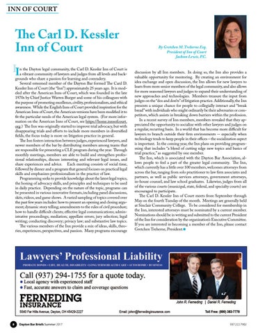 n the Dayton legal community, the Carl D. Kessler Inn of Court is a vibrant community of lawyers and judges from all levels and backgrounds who share a passion for learning and comradery. Several esteemed member of the Dayton Bar formed The Card D. Kessler Inn of Court (the “Inn”) approximately 25 years ago. It is modeled after the American Inns of Court, which was founded in the late 1970s by Chief Justice Warren Burger and some of his colleagues with the purpose of promoting excellence, civility, professionalism, and ethical awareness. While the English Inns of Court provided inspiration for the American Inns of Court, the American versions have been modified it to fit the particular needs of the American legal system. (For more information on the American Inns of Court, see https://home.innsofcourt. org.) The Inn was originally started to improve trial advocacy, but with disappearing trials and efforts to include more members in diversified fields, the focus today is more on litigation practice in general. The Inn fosters interaction between judges, experienced lawyers, and newer members of the bar by distributing members among teams that are responsible for presenting a CLE program during the year. Through monthly meetings, members are able to build and strengthen professional relationships, discuss interesting and relevant legal issues, and share experiences and advice. Each meeting consists of social time, followed by dinner and a program that general focuses on practical legal skills and emphasizes professionalism in the practice of law. Programming seeks to provide knowledge about the latest legal topics, the honing of advocacy skills, and principles and techniques to be used in daily practice. Depending on the nature of the topic, programs can be presented in various innovative formats, including panel discussions, skits, videos, and game shows. A varied sampling of topics covered over the past few years includes: how to present an opening and closing argument; dynamic story telling; amendments to the rules of civil procedure; how to handle difficult clients; effective legal communications; administrative proceedings; mediation; appellate errors; jury selection; legal writing; conducting discovery; privacy law; and substantive law topics. The various members of the Inn provide a mix of ideas, skills, theories, experiences, perspectives, and passion. Many programs encourage