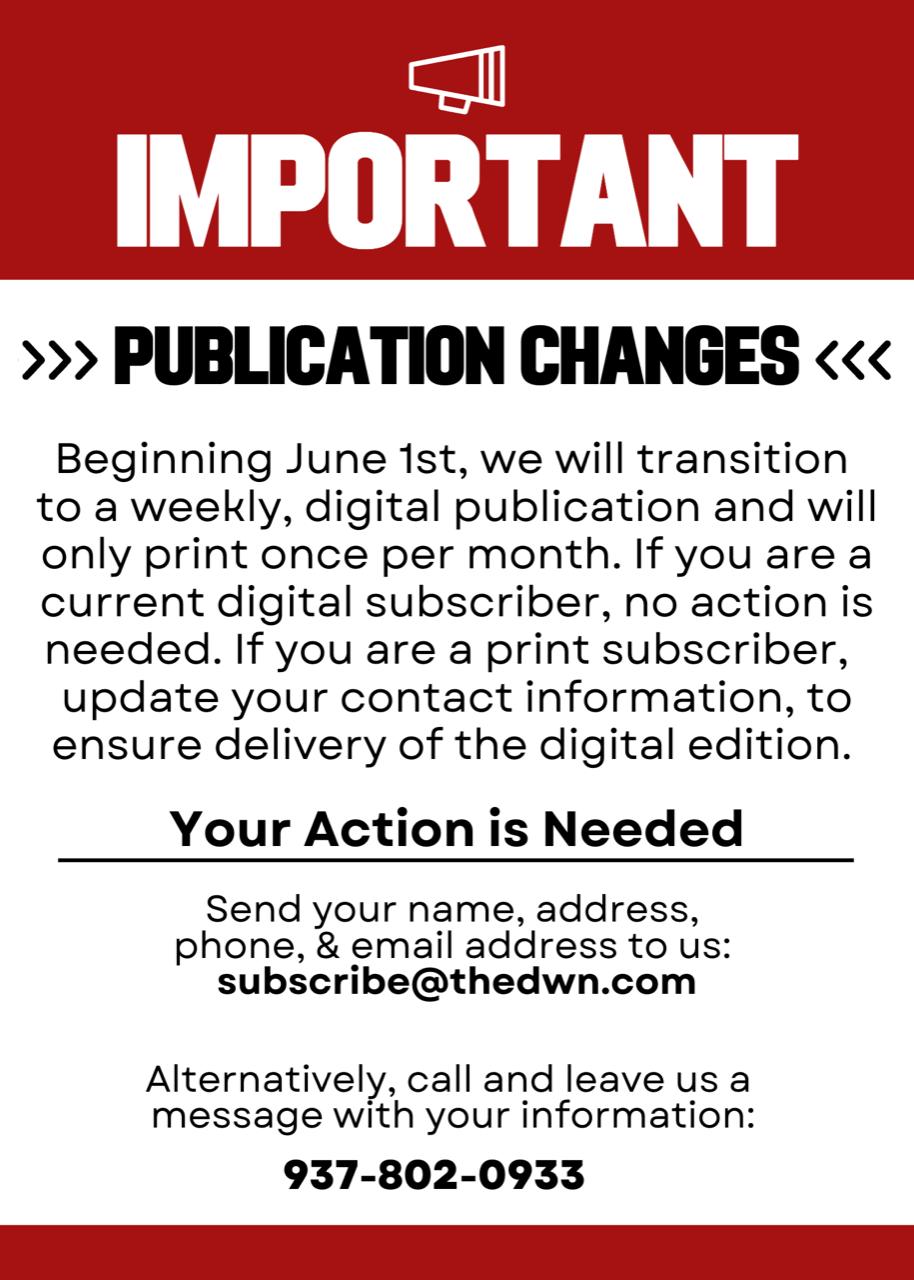 Dayton Weekly neWs - June 2 - 9, 2023 page - 8 Subscription Order BlankClearly PRINT All Information Name: Company: Address: Apt #: City: State Zip: Telephone Day: ( ) Evening: Make check or money order payable to: Dayton Weekly News- Credit Cards Accepted or Subscribe or pay online at DaytonWeeklyonline.com Subscription: $50.00 per year Business Personal Gift Attn: Circulation Dept. 1501 N. Main St. Dayton, Ohio 45405 Sales Rep. Code