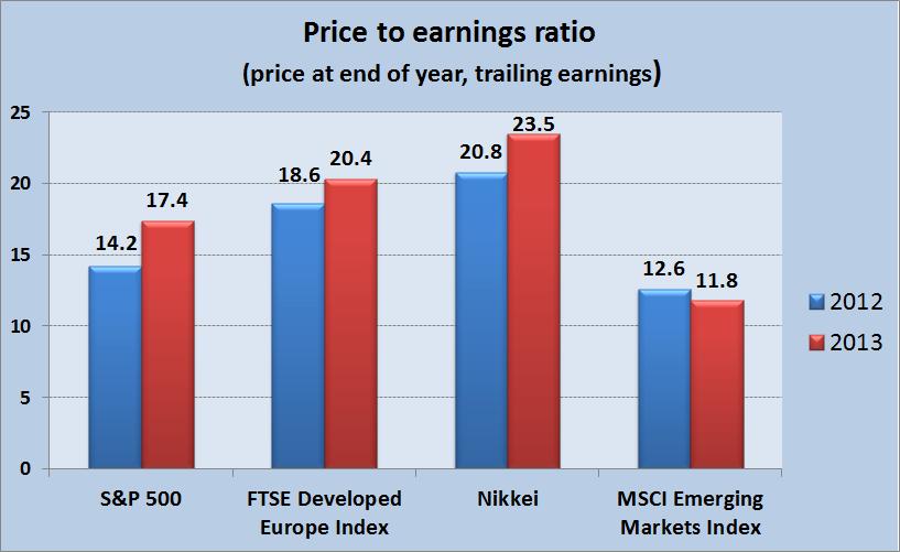 multiples, as investors discounted expected earnings at a lower rate. The S&P 500 rose 32.4% (dividends included) in 2013 but reported earnings in the year were up only 6%. The S&P 500’s price-to-earnings ratio