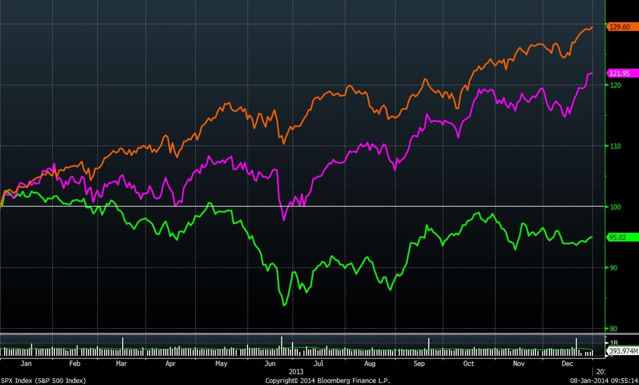 dramatically last year, with the yield on the 10-year Treasury rising from 1.76% at the start of the year to 3.03% by year-end. The Barclays Aggregate Bond Index fell 2% last year, its first fall in 14 years. All of this came in response to announcements that the Federal Reserve would slow down bond purchases, beginning in 2014. Reported inflation, as well as inflation expectations, have remained very low, and the increase in interest rates mainly reflects an increase in the real interest rate. It’s important to note that even with last year’s interest rate increase, rates are still quite low by historical standards. We believe rates will continue to rise in 2014 as economic growth picks up, employment improves, and the Fed slowly but surely ends quantitative easing. That said, rates are likely to remain low on the short end of the yield curve, as the Fed is promising to keep the fed funds rate near zero into 2015. U.S. stocks are fully valued, and there are better opportunities in the emerging markets and in Europe.