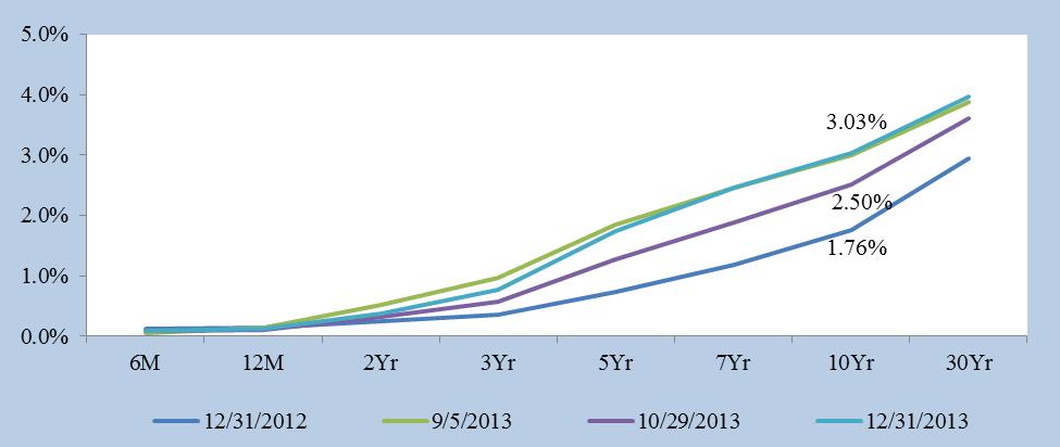 The fixed income markets declined again in December as the Federal Reserve initiated the long anticipated “tapering” of its Quantitative Easing (QE3) bond buying program from $85 billion to $75 billion per month. Although this was a very modest reduction, the Fed also stated that it may completely terminate QE3 by year -end 2014 if economic conditions are sufficiently strong. Treasury benchmark yields have surged since the Fed started publicly discussing tapering in May (see Exhibit 1). The