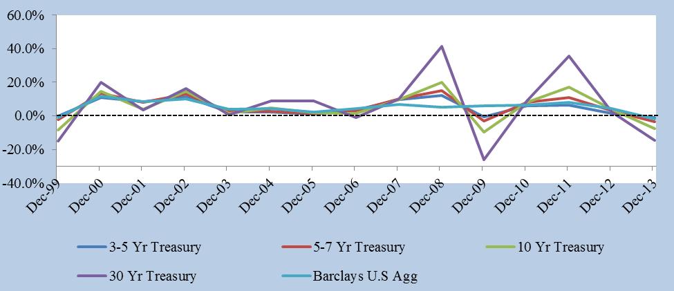 As a result of the increase in intermediate and long term rates, the bond market suffered its first annual loss in 14 years, as measured by the Barclays U.S. Aggregate Index. 30-year U.S. Treasury bonds returned a negative 15.0% in 2013, while the 10-year bond was off 7.8%. The Barclays U.S. Aggregate index declined 2.02%, while the U.S. Mortgage Back Securities (MBS) and Intermediate U.S. Government