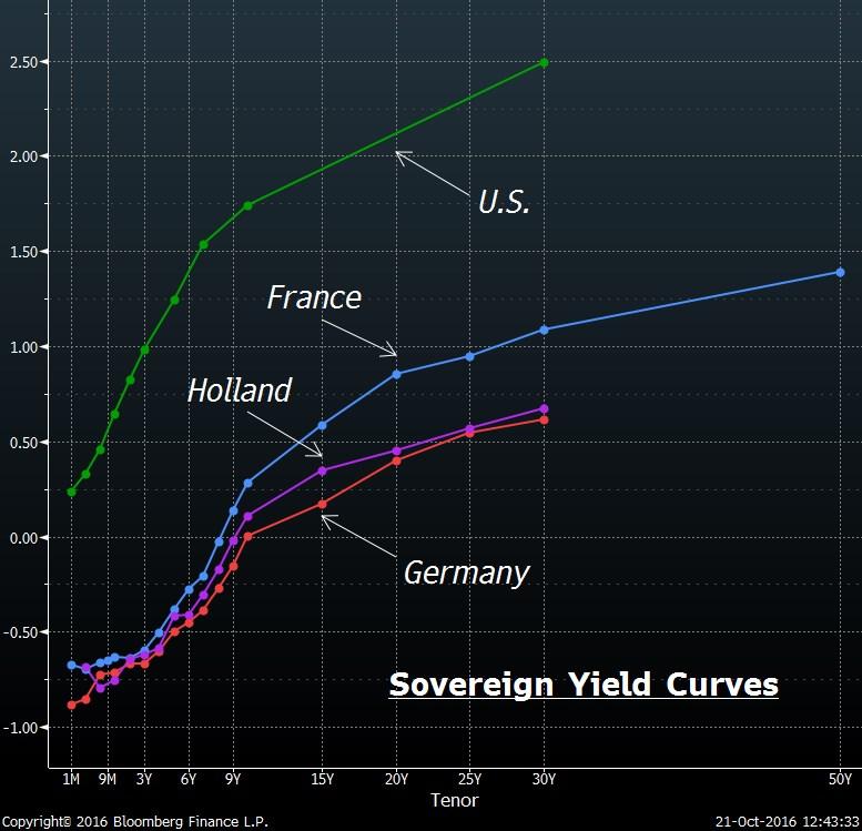 July. The yield of a 10-year Treasury bond today sits at 1.74%. The United Kingdom represents a special case in Europe, as its yield curve has risen significantly since August. The British pound has sold off, and is down 18% against the U.S. dollar since the day the Brexit vote was held. Inflation in the U.K has spiked since June, with investors expecting inflation during the next five years to be 3.0%, up from 2.2% in June.