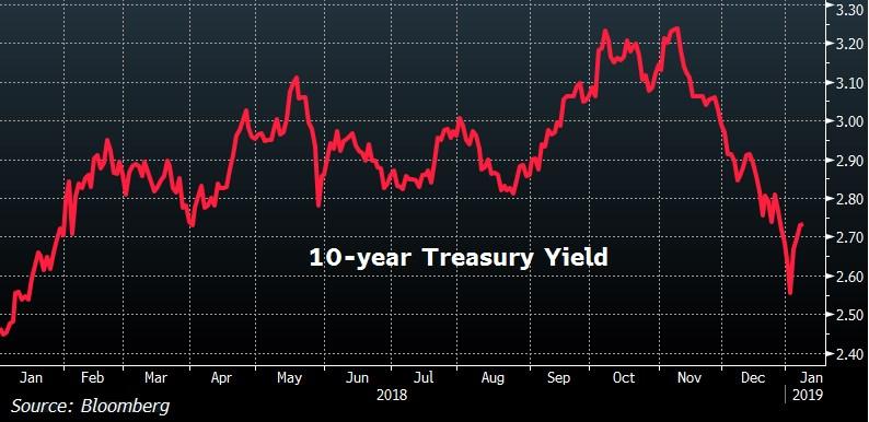 the Federal Reserve will be able to raise the fed funds rate two times in 2019 as policymakers have guided, and view no hikes at all during the year as the most likely outcome. This is already incorporated into market prices. Rate cuts could be on the table if the environment continues to deteriorate, but we view it as more likely that the Fed will slow the pace of its balance sheet runoff. Fed chair Jerome Powell said on January 4 that the Fed “will be prepared to adjust policy quickly and flexibly and to use all of our tools to support the economy.” Still, it’s safe to say that rate cuts will only occur as a last resort. New dovishness from the Fed, which we expect, is likely to be bearish for long-term Treasury bonds as investors’ fears of policy overshoot recede.