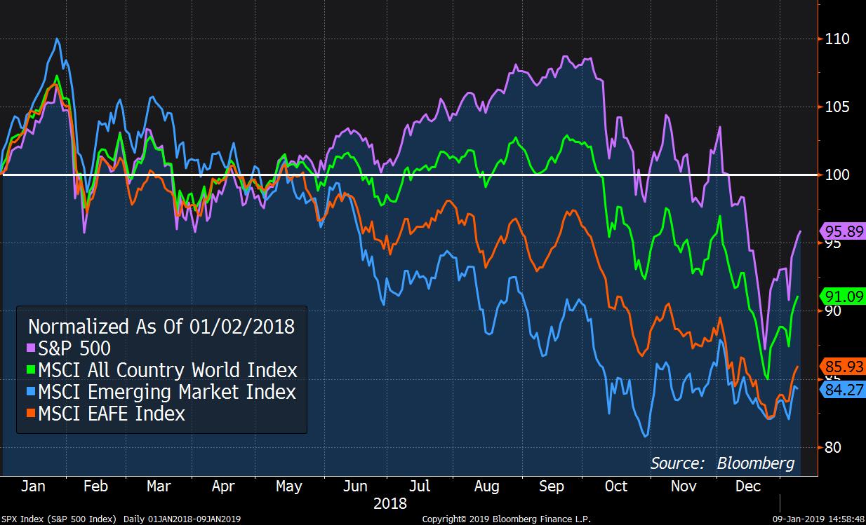 The stock market ended 2018 on a volatile note with the same factors that caused long-term Treasury yields to fall and the yield curve to flatten (trade conflict, Federal Reserve overshoot, slowing economic growth) converging to push equity investors to reassess their previous sanguine outlook. The MSCI All Country World Index (which measures the global stock market) fell 12.7% in the fourth quarter, returning -9.0% for full-year 2018. The S&P 500, a measure of large cap domestic stocks, was down 13.5% in the fourth quarter and returned -4.4% for the full year. The MSCI EAFE Index, which tracks international developed (ex-U.S.) equities, fell 13.3% in 2018, while the MSCI Emerging Markets Index was down 14.5%.
