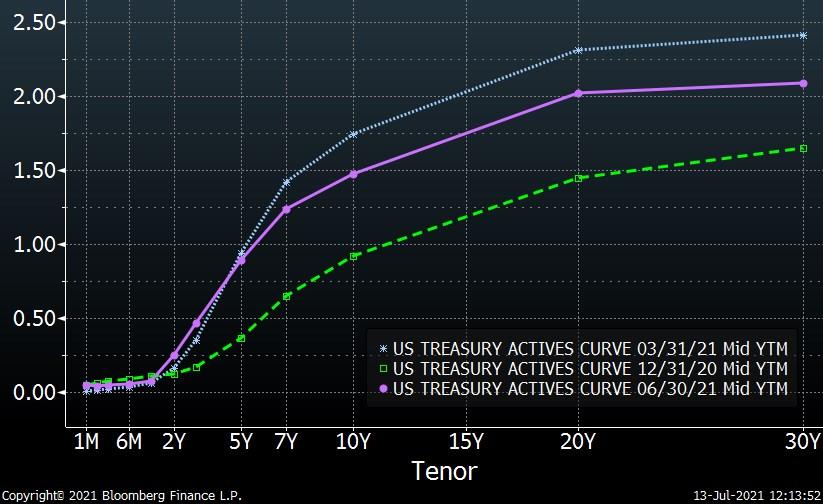 The U.S. Treasury yield curve flattened during the second quarter, with the long end of the curve falling moderately and the short end largely unchanged. Many bond investors began to worry in May that higher inflation breakeven rates might move U.S. Federal Reserve policymakers to tighten monetary policy faster than had been previously expected. These worries eased in June, however, after economic data showed the recovery to be weaker than booming numbers earlier in the quarter indicated. The weaker data were consistent with the consensus view of the Fed’s policymaking team that higher inflation is a short-term phenomenon, and the long end of the yield curve fell accordingly. It now appears likely that the longanticipated “tapering” by the Fed of monthly agency mortgage-backed se-