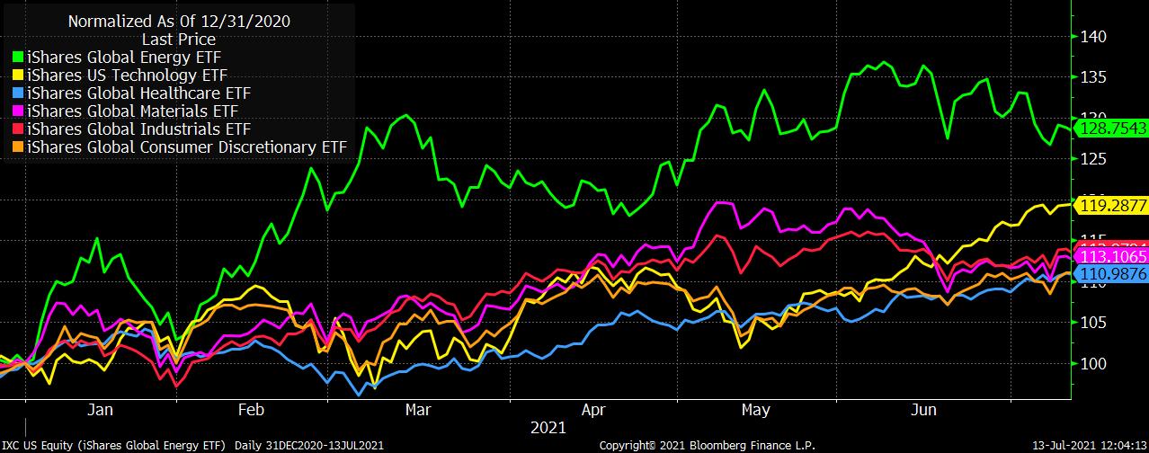 As the third quarter begins, our equity portfolios are overweight the healthcare and industrial sectors, and have underweight