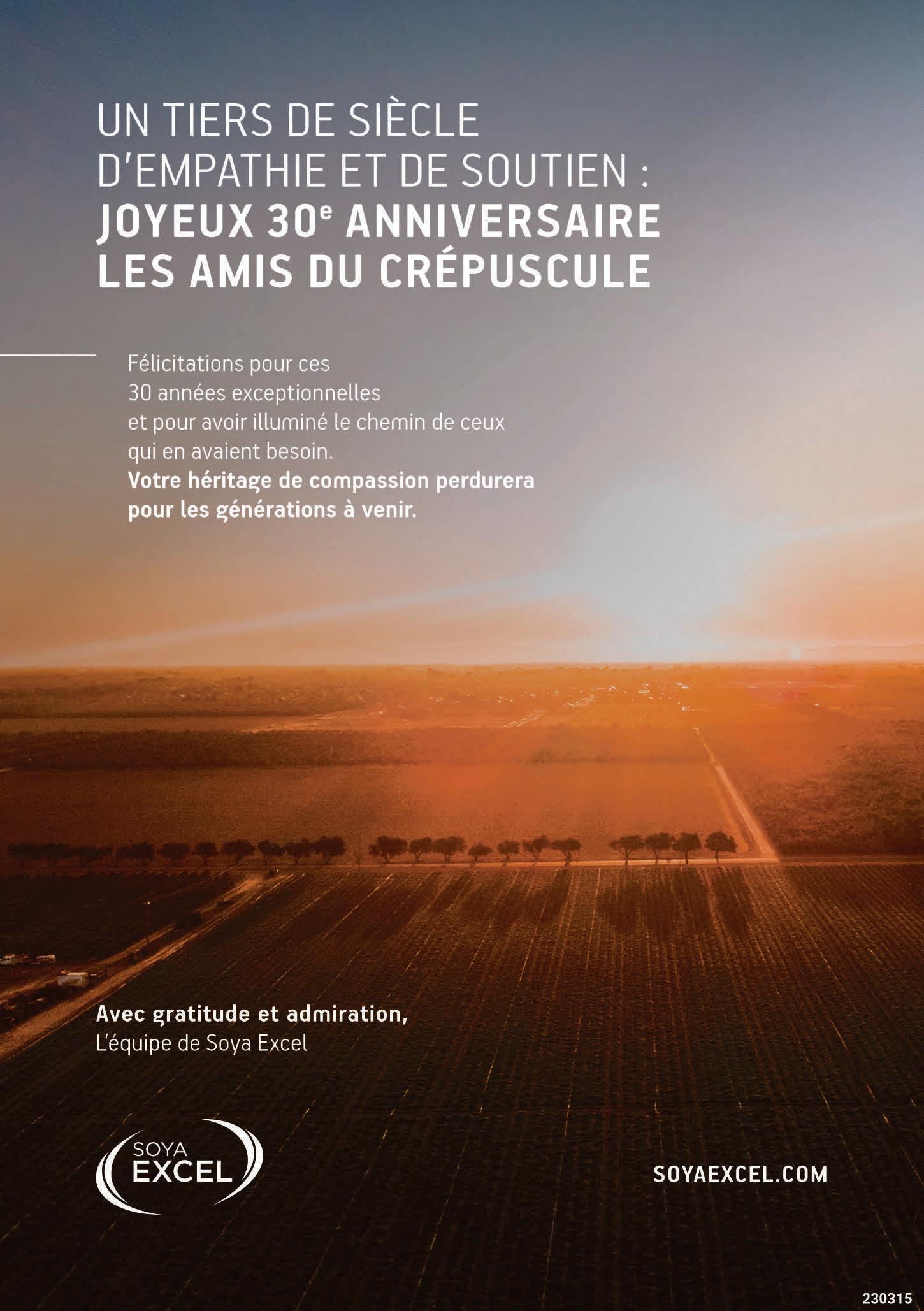 Les Amis du crépuscule : 30 ans déjà! Ce colloque sera l’occasion de célébrer le 30e anniversaire de l’organisme Les Amis du crépuscule, qui soutient les personnes endeuillées ainsi que les personnes en fin de vie et leurs proches. Depuis sa fon dation en 1993 par des professionnels de la santé, ses bénévoles qualifiés ont accom pagné près de 15 000 personnes provenant de la Montérégie et des régions avoisi nantes avec écoute, bienveillance et res pect. Coût : 150 $, dîner inclus.