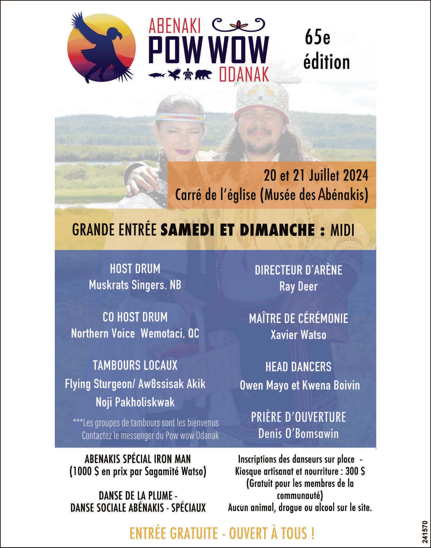 L’accès et les activités du Pow-Wow sont gratuits. À noter qu’il n’y aura pas de soirée dansante cette année, mais une soirée bingo aura lieu le samedi soir. Pour avoir plus de