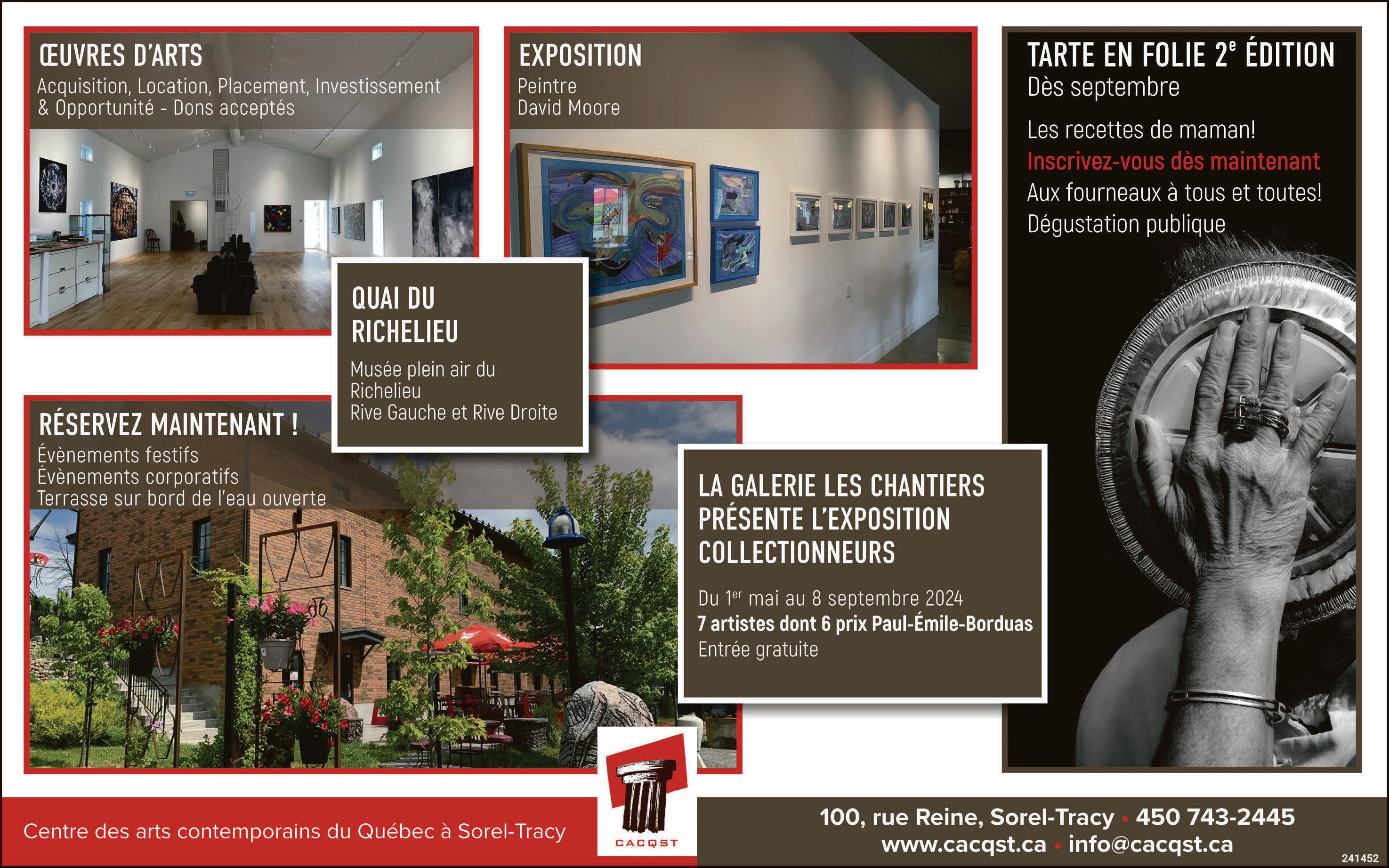 D’ici là, le CACQST, dont la vocation est de démocratiser l’art et la culture, met présentement en place le Musée plein-air de la côte du Richelieu, le plus grand musée du genre au Canada. Réalisé en collaboration avec le Musée des beaux-arts de Mont-SaintHilaire, cet impressionnant projet collectif vise à installer des œuvres qui pourront être visitées par le public dans toutes les municipalités le long de la rivière Richelieu, jusqu’à la frontière des États-Unis.