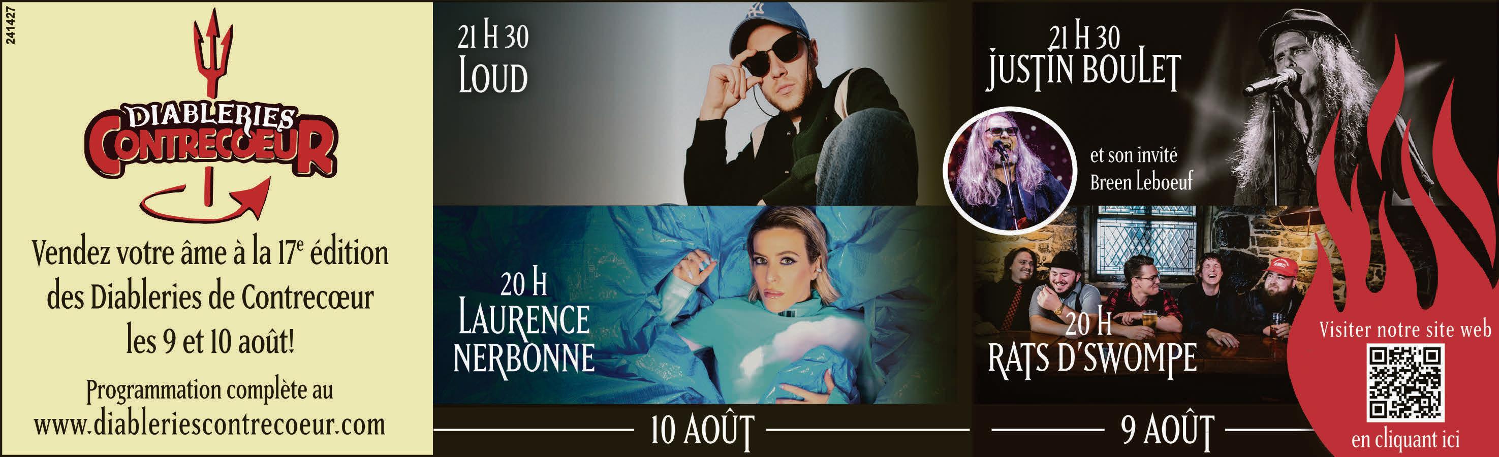 Également en lien avec la légende de la Chasse-Galerie, Les Diableries de Contrecœur auront lieu les 9 et 10 août au parc Antoine-Pécaudy. La programmation endiablée, comprenant Justin Boulet et Breen Lebœuf ainsi que le rappeur montréalais Loud, promet d’en mettre plein les yeux et les oreilles des spectateurs. Pour ne rien manquer cet été à Contrecœur, on suit les pages Facebook de la Ville, de Culture C et des Diableries.