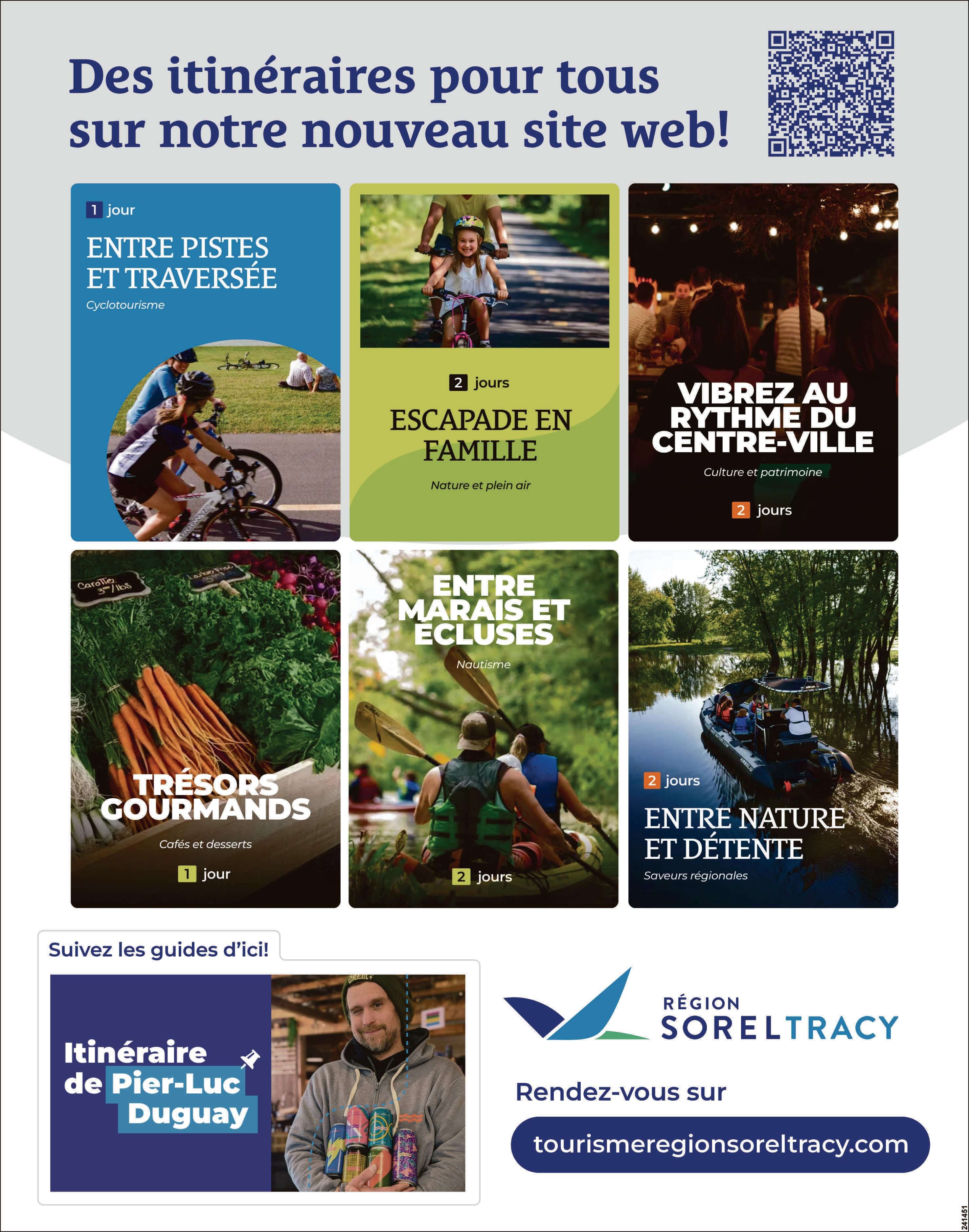 Signe d’une région qui bouge sans arrêt, Tourisme région Sorel-Tracy lance aussi un nouveau site Web, renouvelé, de nouveaux itinéraires personnalisables qui seront en ligne et sur la page Facebook, une carte pour les amateurs de planche à pagaie, un signet touristique avec code QR, etc. « Tous nos membres ont refait leur photo professionnelle pour notre site Web pour que le tout soit encore plus attrayant. »