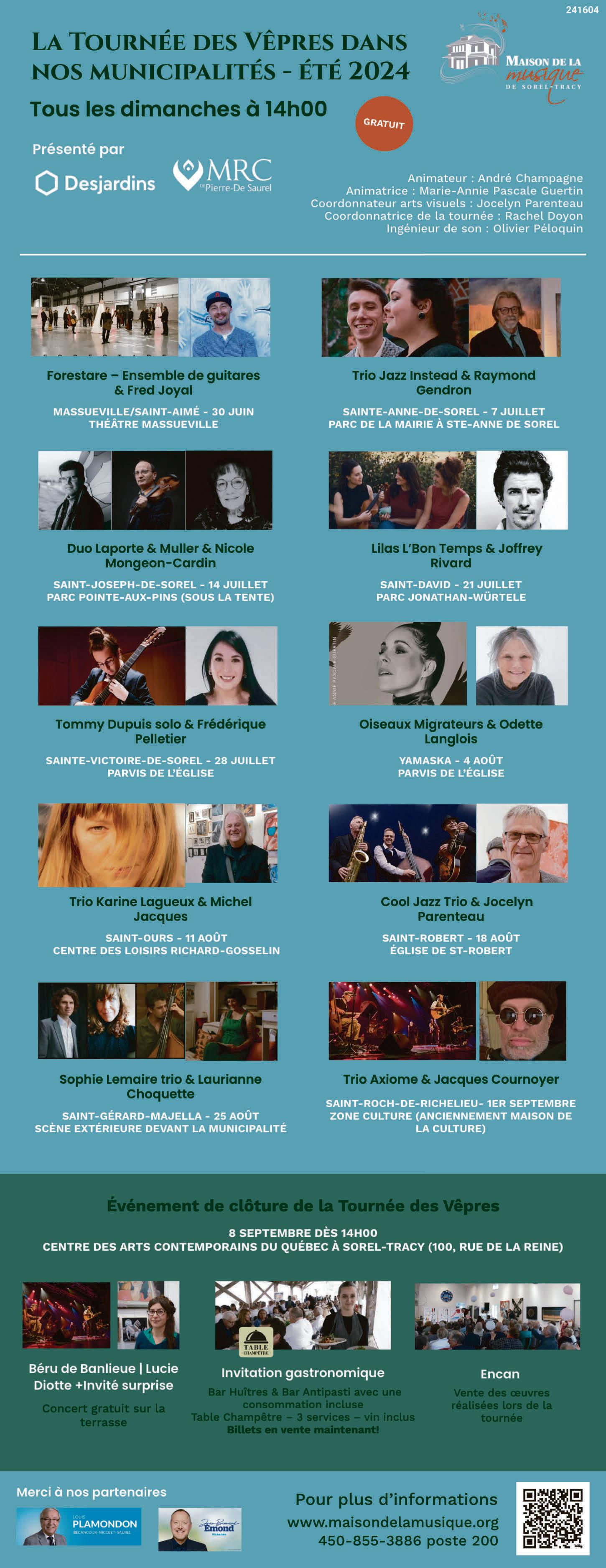 Chaque dimanche, du 30 juin au 8 septembre, à 14 h, la Tournée des Vêpres musicales propose une célébration unique mêlant musique, art et histoire locale. Des performances musicales et artistiques sont présentées devant le public, offrant un éventail de styles et de genres musicaux. Aussi, il s’agit d’une occasion parfaite pour se promener au travers les diverses municipalités de la MRC Pierre De-Saurel, tout l’été.