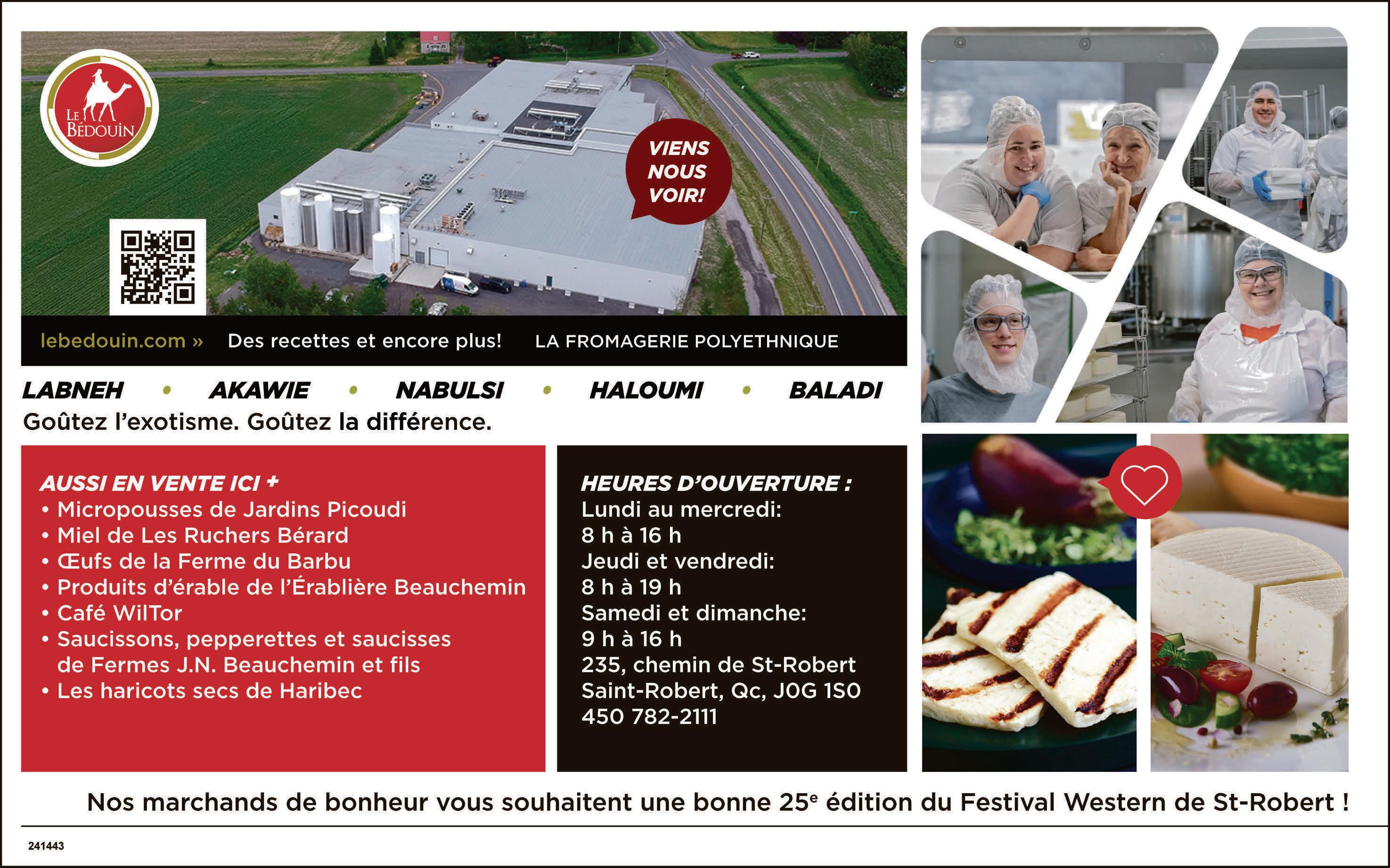 Vous savez que vous êtes à Saint-Robert quand, en roulant sur la montée SainteVictoire, au cœur du territoire agricole qui nous définit également, vous passez près de la Fromagerie Polyethnique Le Bédouin. Continuez vers Massueville pour vous arrêter au parc du Carré royal qui, de l’église, la surplombe à la rivière Yamaska en contrebas, vous présente la halle qui fait sa renommée.