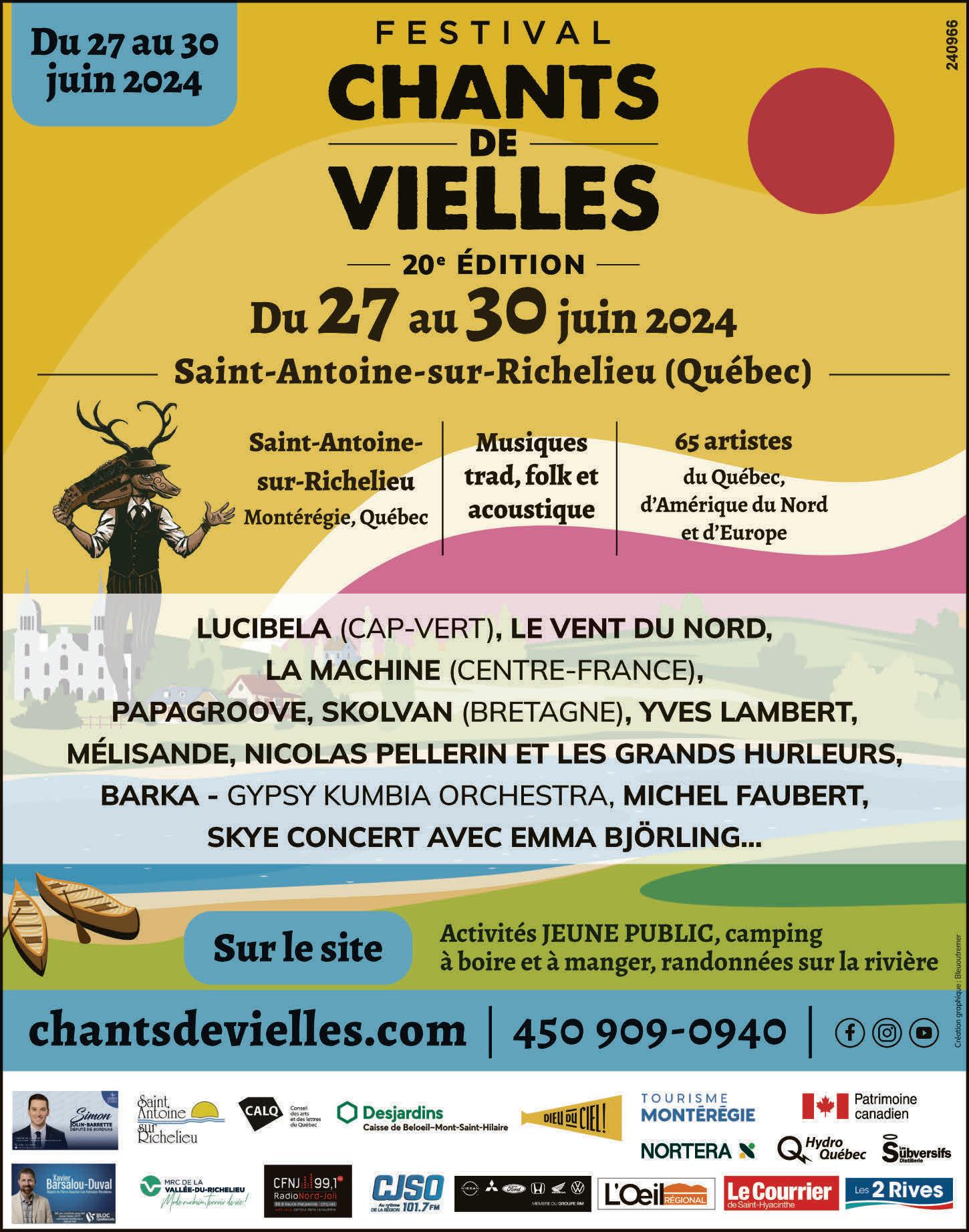 Côté divertissement, le site sera animé musicalement durant l’ensemble des trois journées, que ce soit grâce à des chansonniers ou à des spectacles ambulants. Sur la scène principale, les organisateurs sont contents d’accueillir cette année Laurence Nerbonne le vendredi 28 juin, le multiinstrumentiste Guy Bélanger le samedi