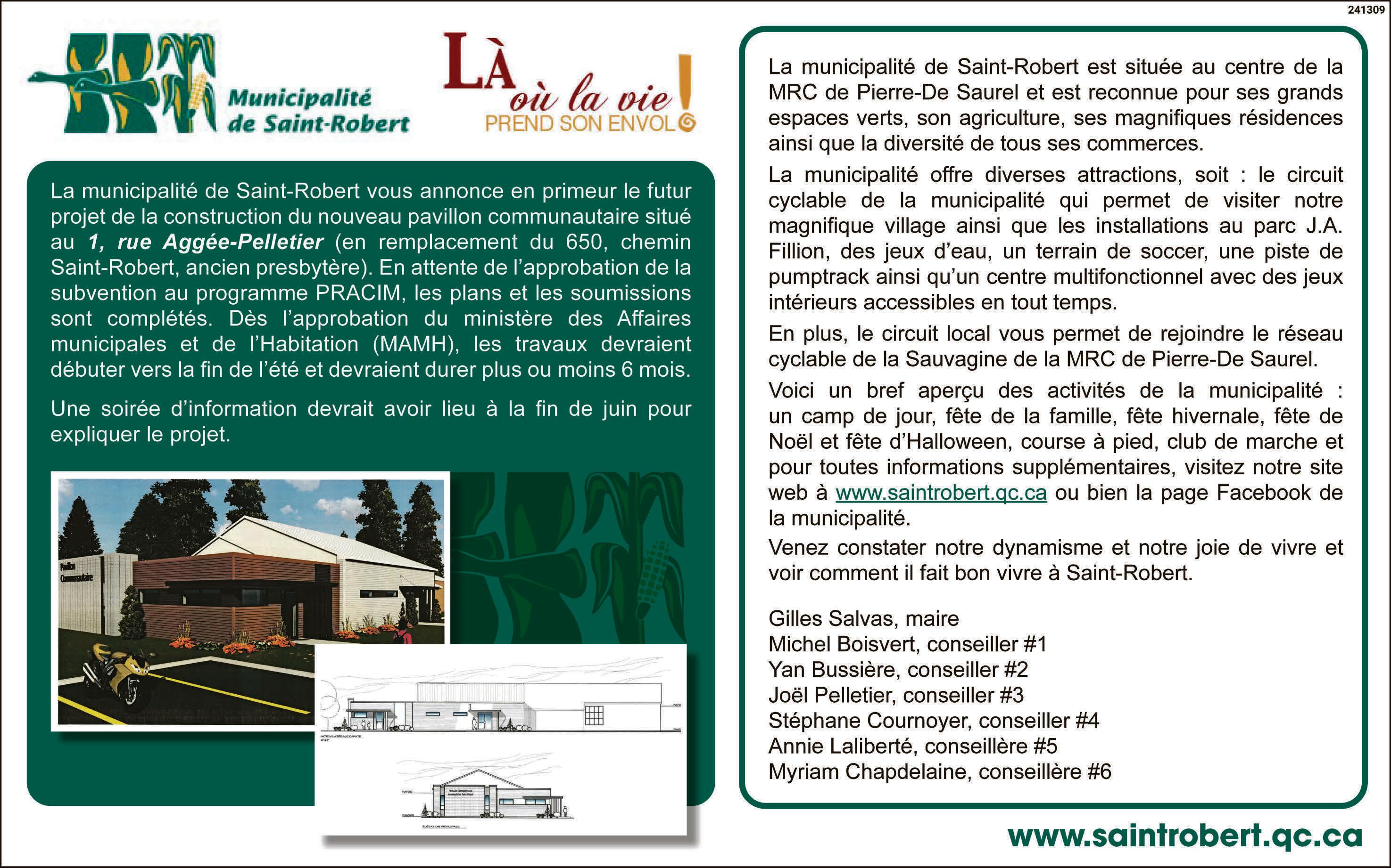 En mars 2023, après une inspection de nos assureurs, le bâtiment du 650, chemin de Saint-Robert, datant des années 1855, s’est vu condamné à une fermeture complète dû à un risque d’effondrement. Donc un nouveau projet verra le jour dans les prochains mois, soit la démolition de l’ancien presbytère et la construction d’un nouveau pavillon communautaire rattaché à la salle municipale existante. Ce projet fait partie des mesures de sécurité civile qui rendra l’endroit accessible en cas de sinistre. Pour terminer, j’invite les gens de toutes les régions à venir visiter notre magnifique municipalité.