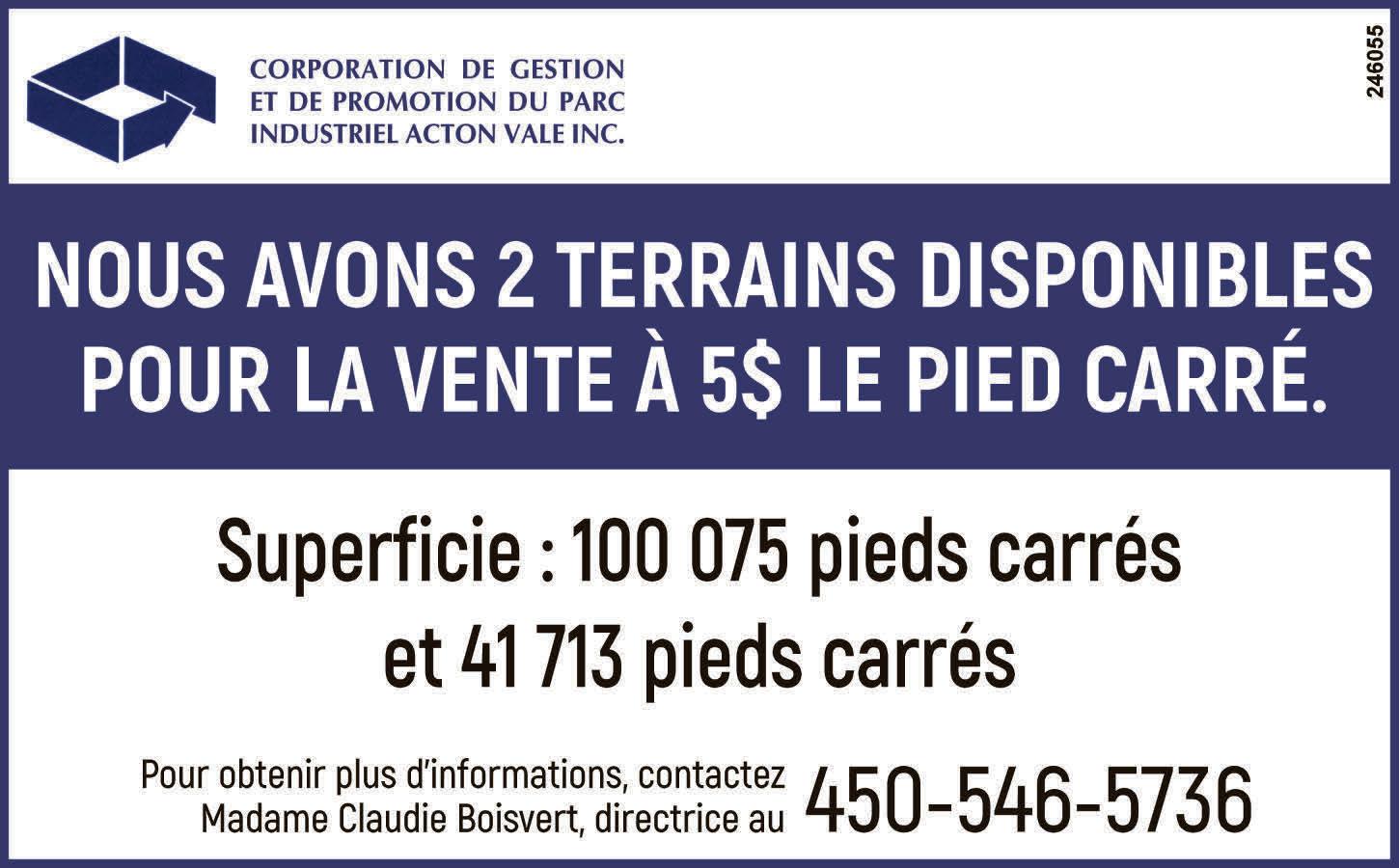 En plus d’offrir des immeubles locatifs, les intervenants de la CGPPIAV, en partenariat avec les autorités municipales, mettent tout en œuvre pour faciliter l’implantation d’entreprises dans le parc industriel d’Acton Vale. D’ailleurs, deux terrains prêts à construire sont disponibles. Un premier de 41 713 pi.ca. et un second de 100 075 pi.ca.