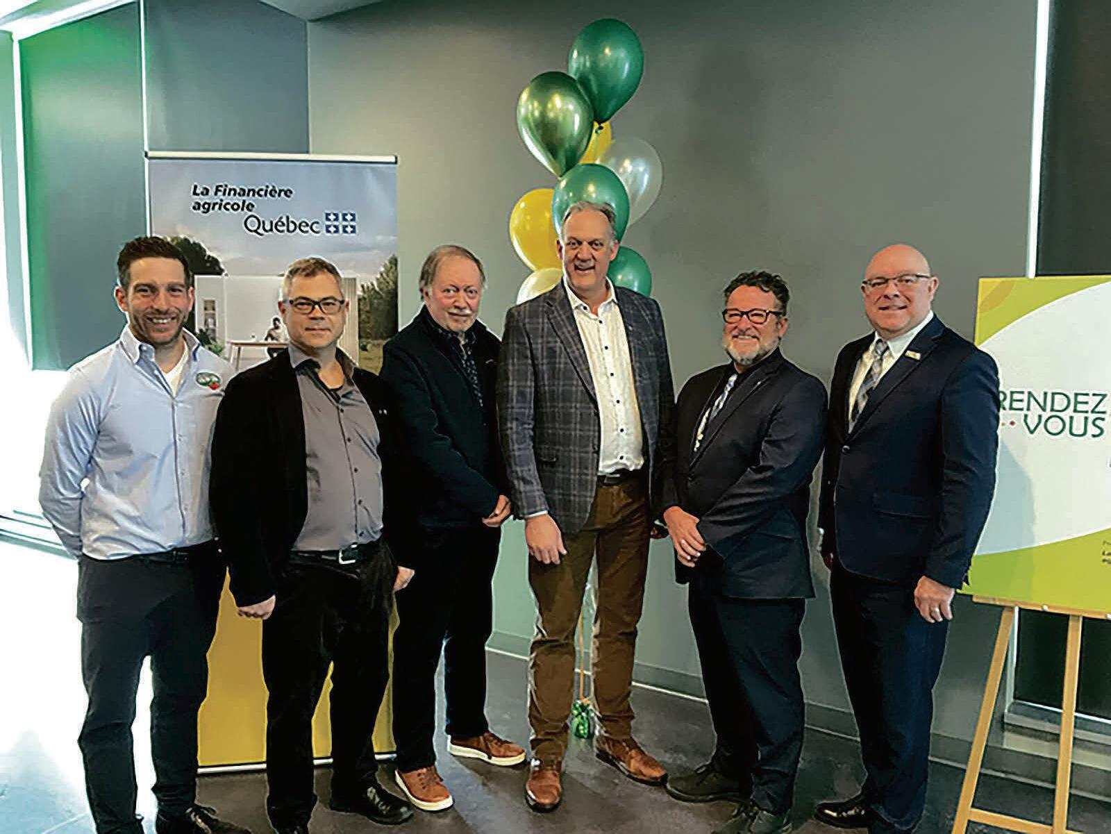 Jonathan Gadbois, copropriétaire de la Ferme Gadbois; Philippe Gazé, directeur régional, FADQ; Lionel Levac, journaliste; Martin Caron, président général de l’UPA; Donald Martel, ministre, MAPAQ; et Stéphane Labrie, président-directeur général de la FADQ. Photo : gracieuseté