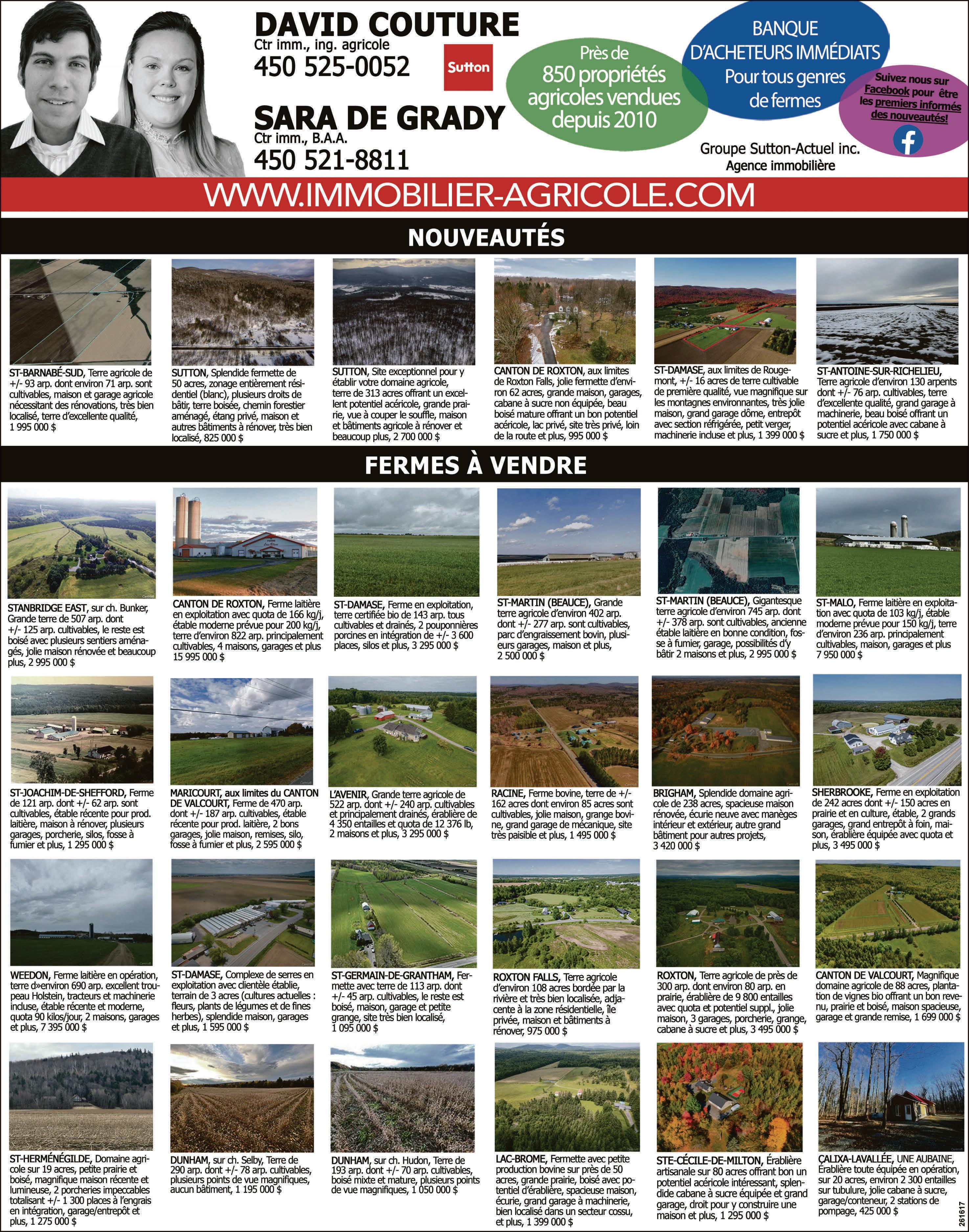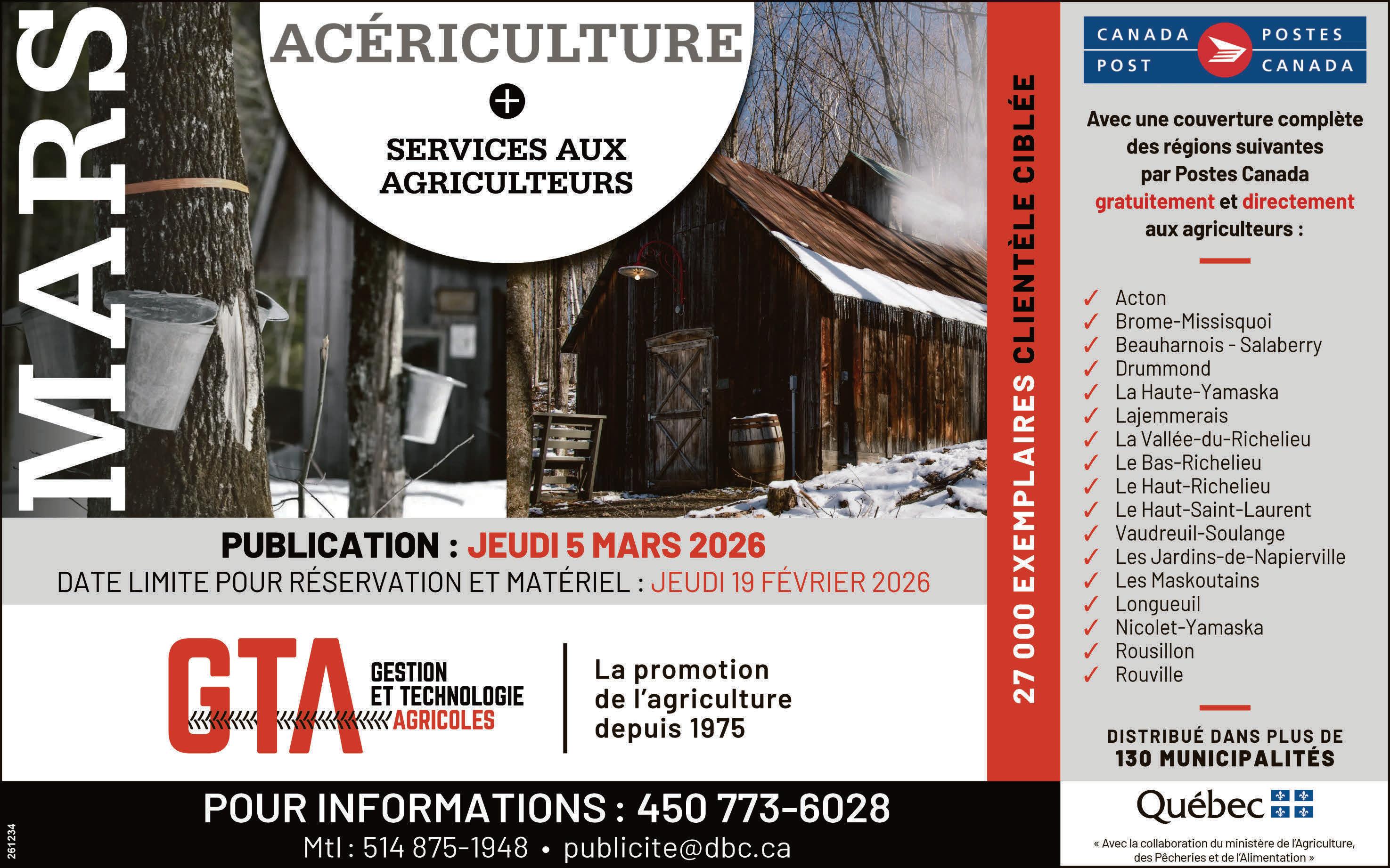 27 000 exemplaires distribués dans Le Courrier de Saint-Hyacinthe et par Postes Canada aux producteurs agricoles dans les régions suivantes : Montérégie-Est Montérégie-Ouest Centre-du-Québec