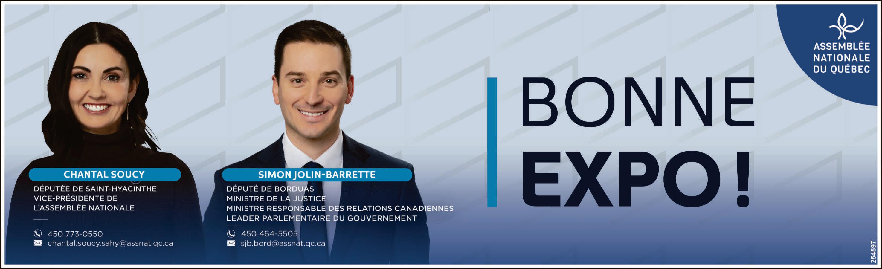 L’organisation de cet événement nécessite des mois de dévouement et de travail acharné. Je tiens à féliciter la Société d’Agriculture de Saint-Hyacinthe pour leur rôle essentiel dans la mise en lumière de notre ville, non seulement au Québec, mais à travers tout le Canada. Je lance un appel aux Maskoutaines et aux Maskoutains : réappropriez-vous votre exposition! Venez nombreux à la journée des résidents, le lundi 28 juillet, où un tarif préférentiel vous sera réservé. C’est une occasion exceptionnelle de partager un moment inoubliable en famille et de découvrir l’univers captivant de l’agriculture, où se mêlent tradition, passion et innovation.